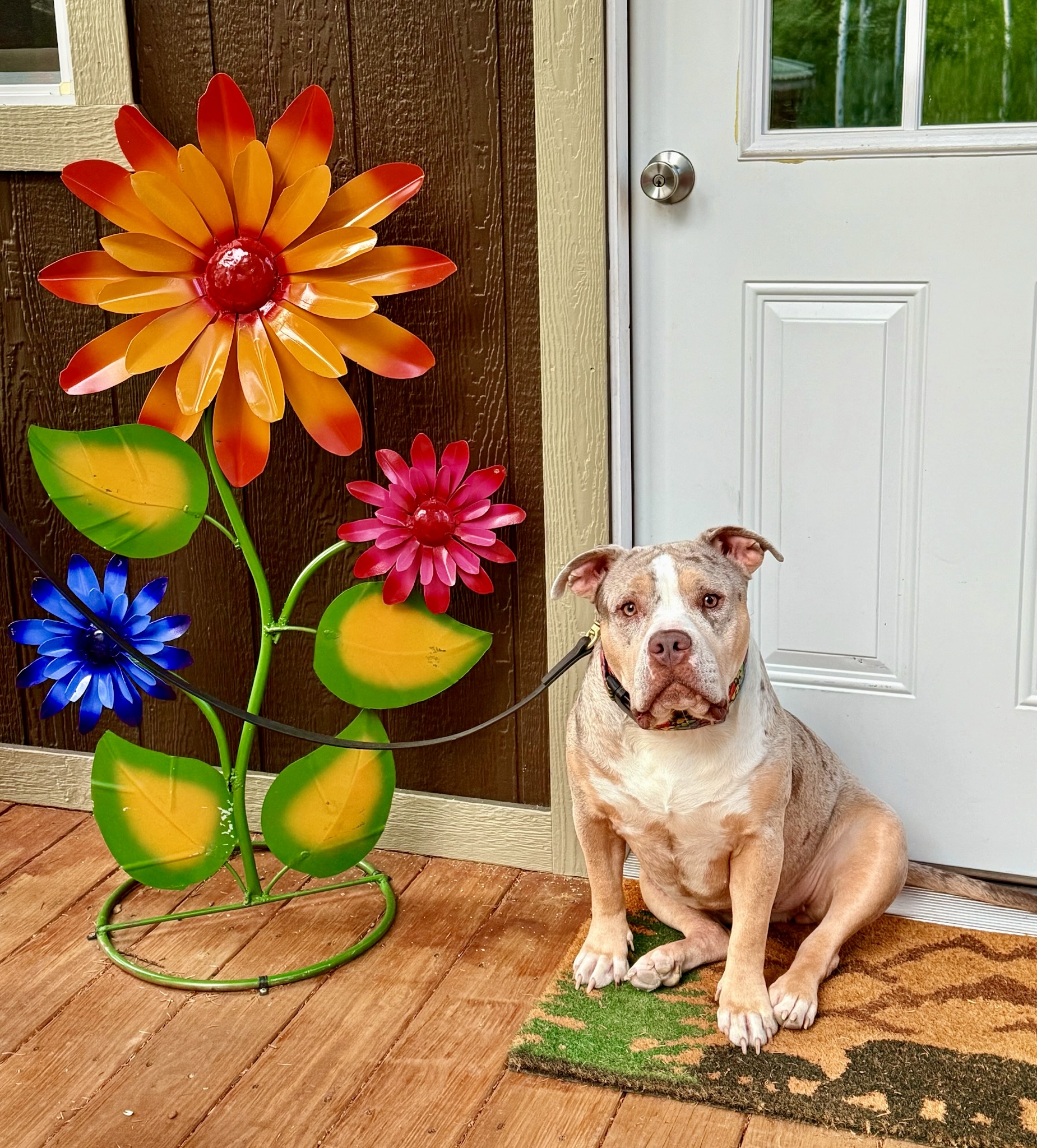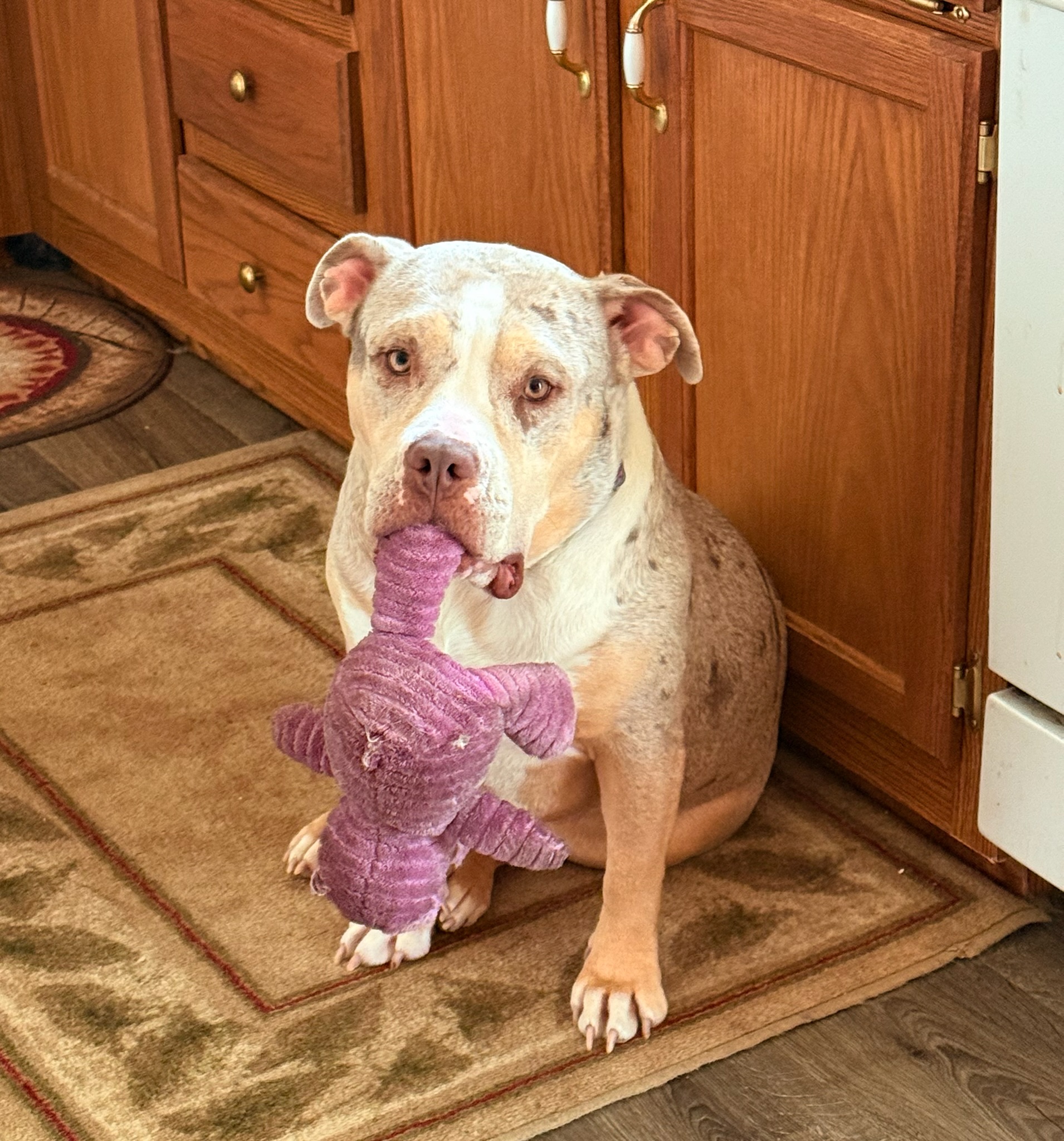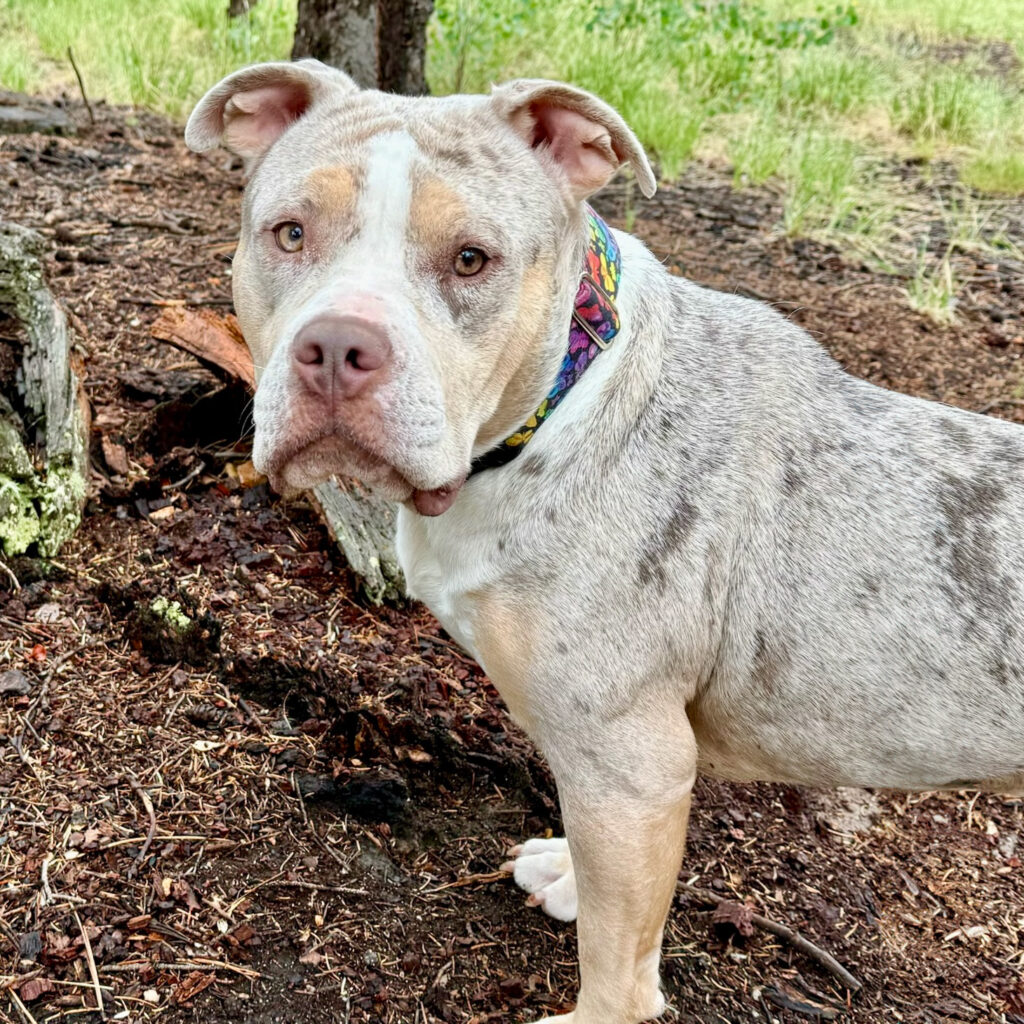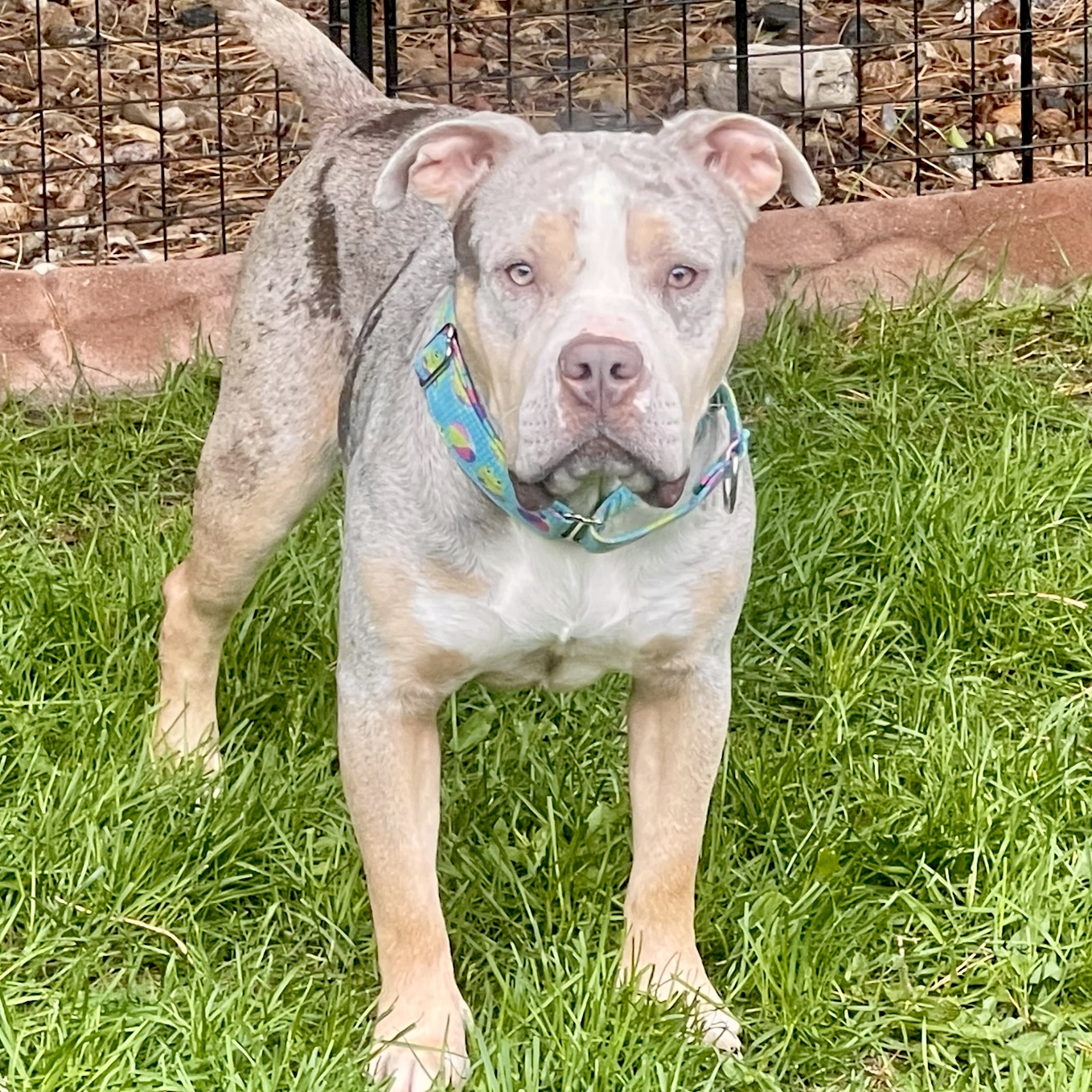 Alex is a 2 year old, female, pittie mix! She’s short and stout weighing in around 55 lbs. Alex had a long list of things she loves: water, car rides, hikes, attention, sunbathing, stuffed animals, and dog friends! She loves to play but she isn’t a high energy girl. She knows how to chill and cuddle for a nap sesh, too. Alex is house and crate trained, walks well on a leash, and is trustworthy free roam at her foster home. She can be a bit shy when meeting new people but she warms up and becomes social and affectionate. Alex is a little piggie and will need humans that can carefully monitor her calorie intake — she had a TPLO surgery and gained some lbs right under our noses! Alex is low heartworm positive and has had treatment. She is due for a retest in approx 6 months.