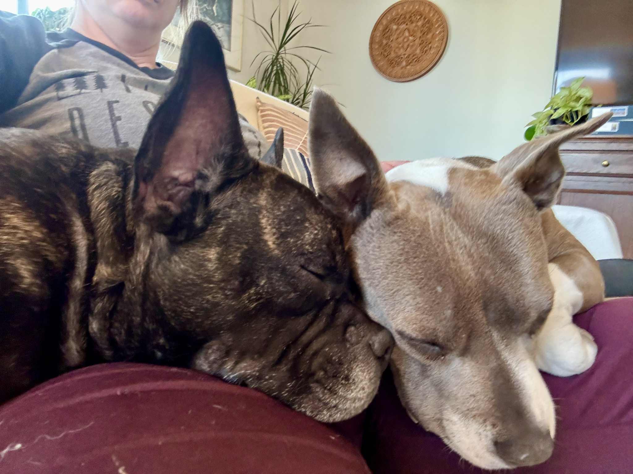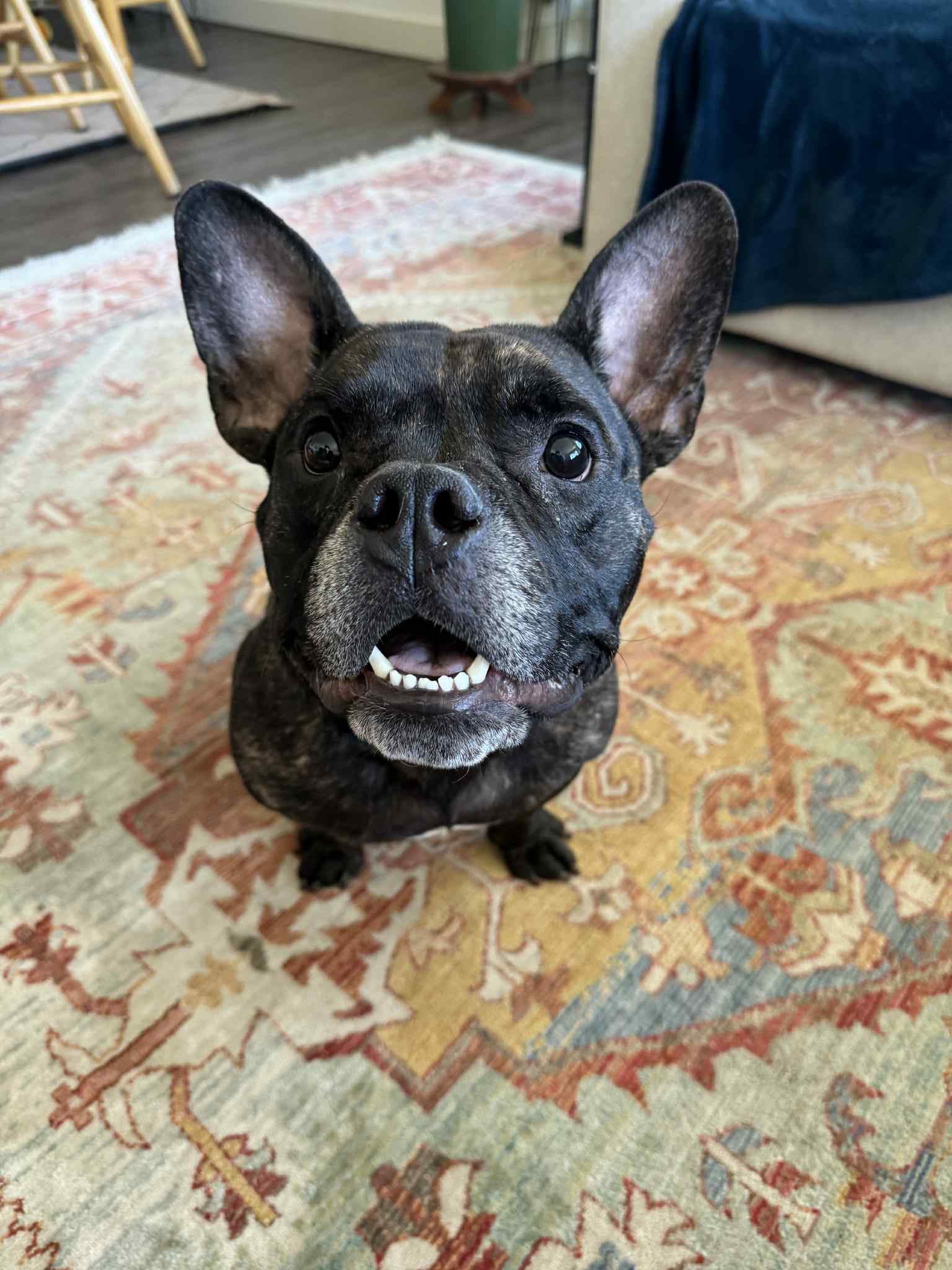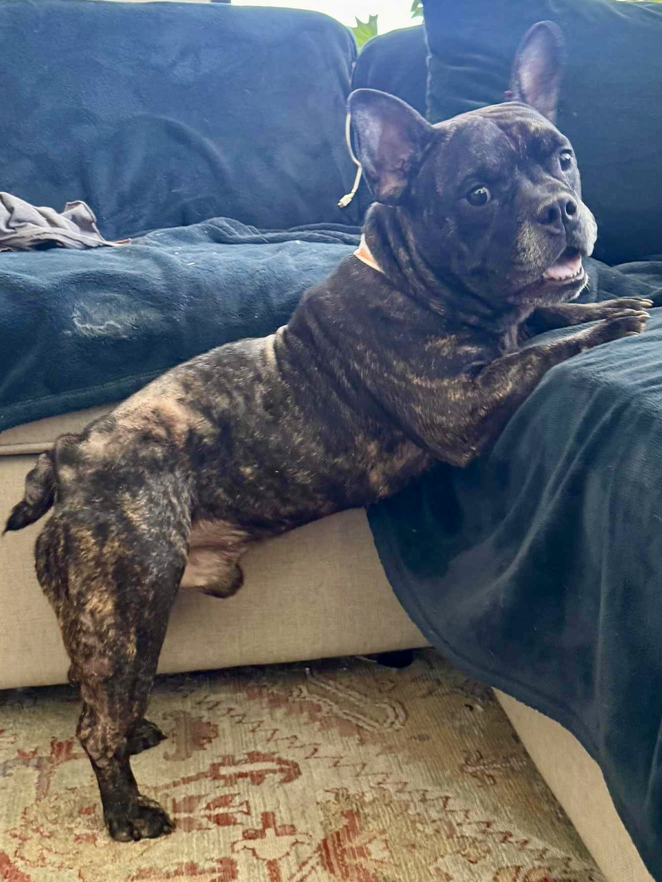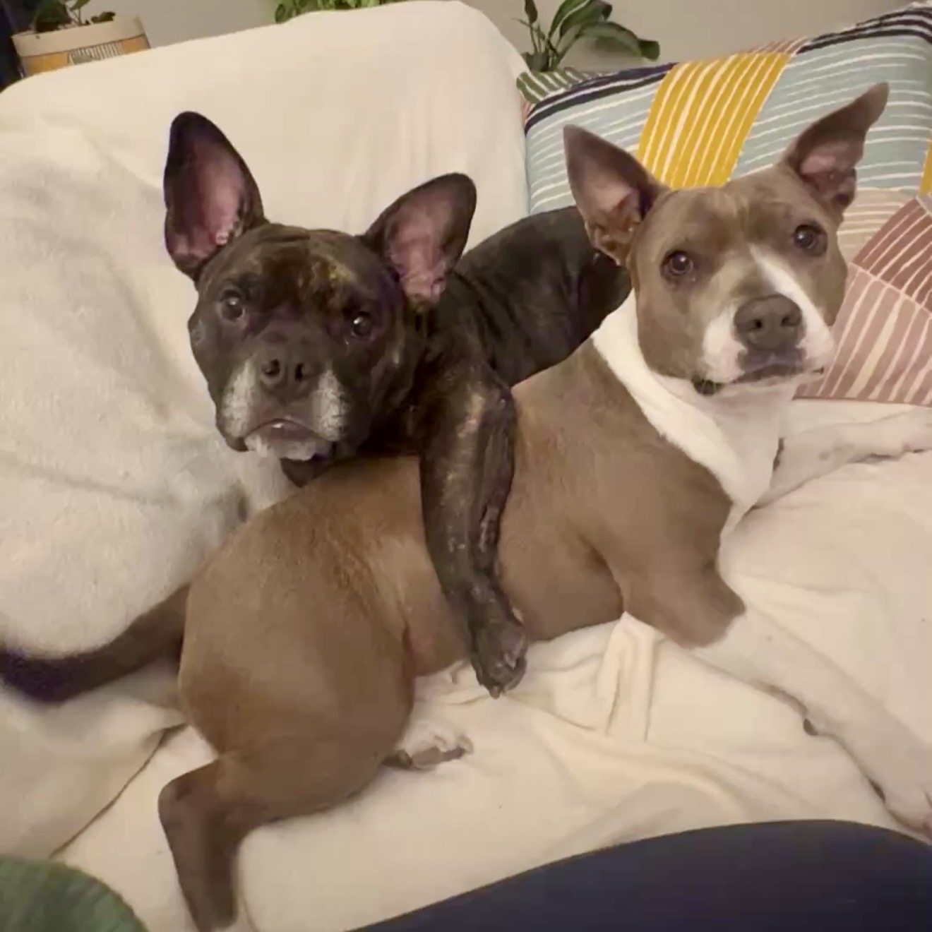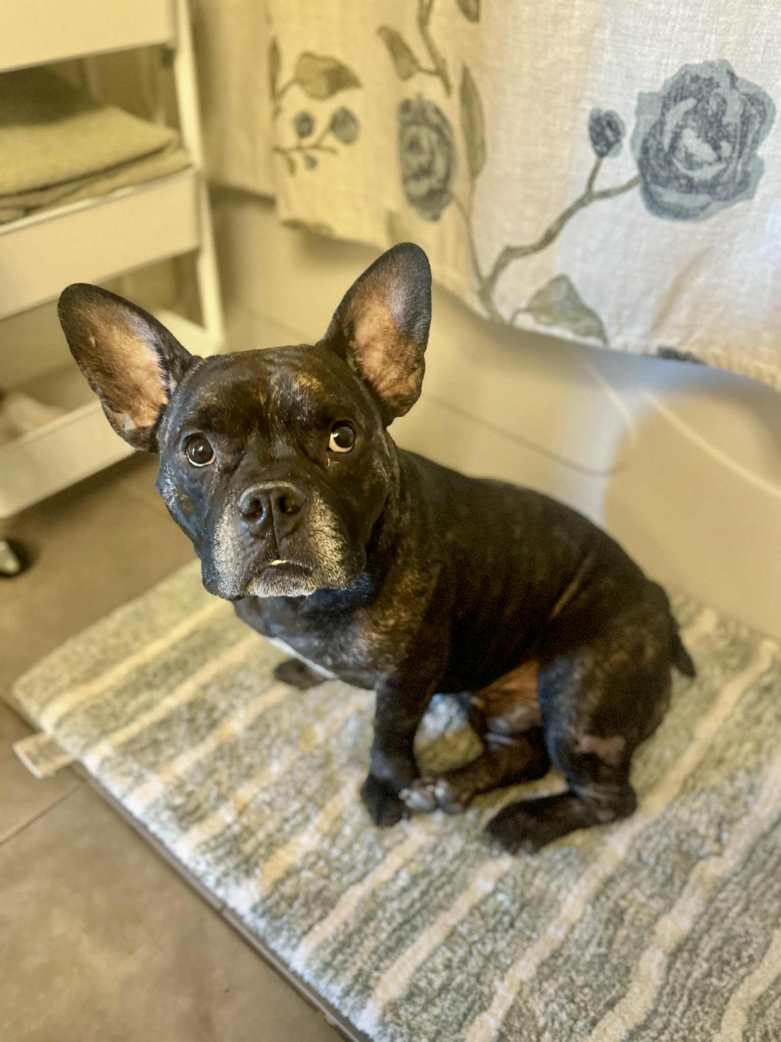 This 3-4-year-old, 42-lb French Bulldog mix is a total sweetheart with a linebacker’s build and the soul of a snuggle bug. With his big blocky head, giant ears, and brindle coat, Brewster looks a little like a dog… and a little like a very charming piglet — and honestly, it just makes him even more irresistible.