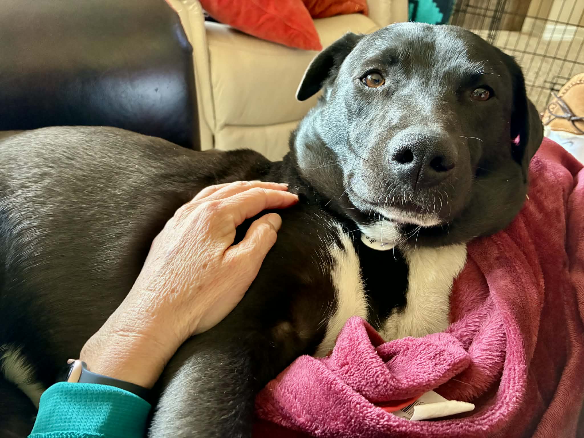 If you’re looking for a dog who views life as one giant party, meet Doc Holliday. He is a 16-month old Lab/Border Collie mix who wants to love you at 100 miles per hour. He is 100% good boy and 110% energy. Doc can be a little timid at first, but once he trusts you, he is sweet, wiggly, and perpetually happy. His skills include professional-grade zoomies, expert snuggling, sliding through the grass like a seal, and being a competitive Nylabone chewer. As a youngster, he is working hard on learning house training and leash manners. He is calm in his crate and sleeps in it through the night. Doc gets along well with his three foster siblings, but could also do really well as the only dog in the house, too. Regardless, he needs a family who will be patient with him and keep him mentally stimulated through consistent training so he can develop into a confident and trusting adult dog. He is smart, deeply devoted to his people, and wants to please. Doc will thrive in an active home where he gets positive reinforcement and “jitterbug” is a term of endearment. He’s ready to find a family that can keep up with his rhythm!