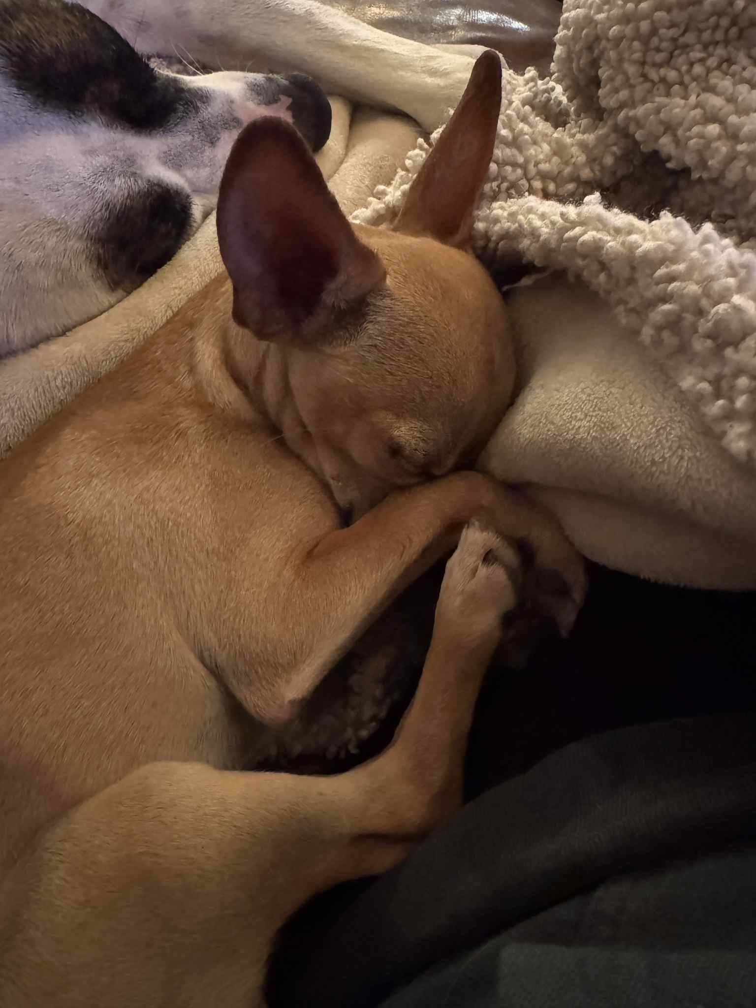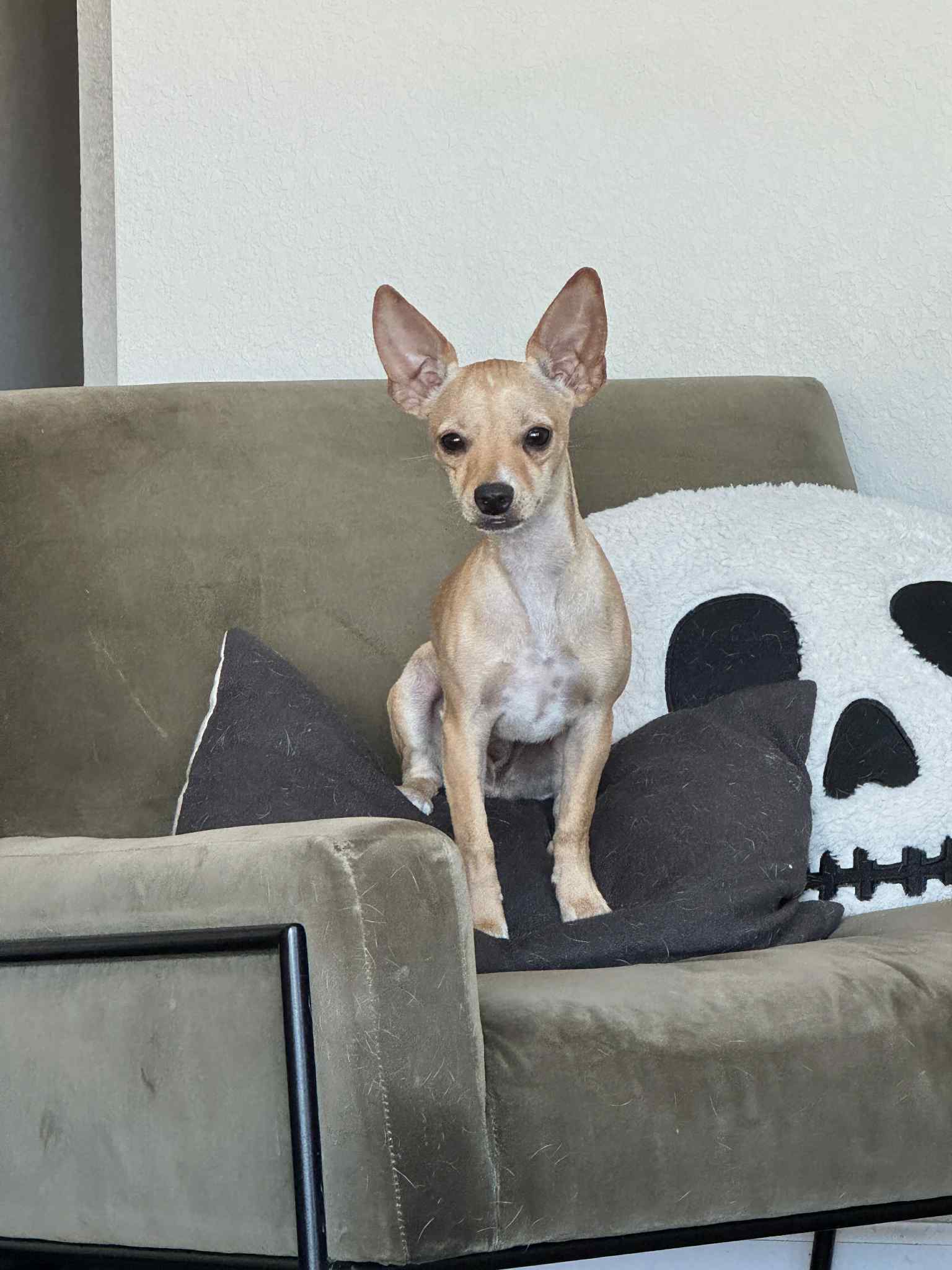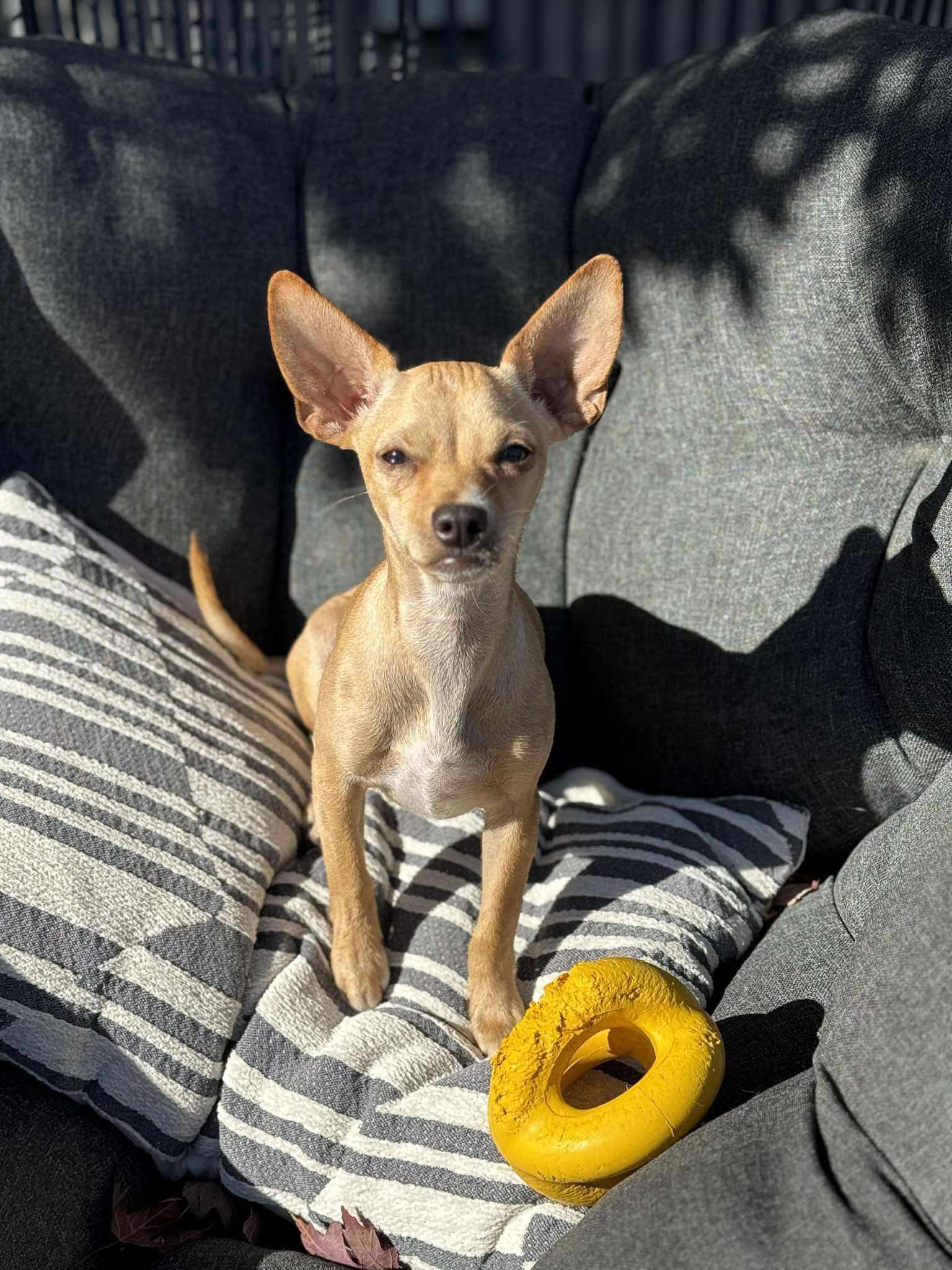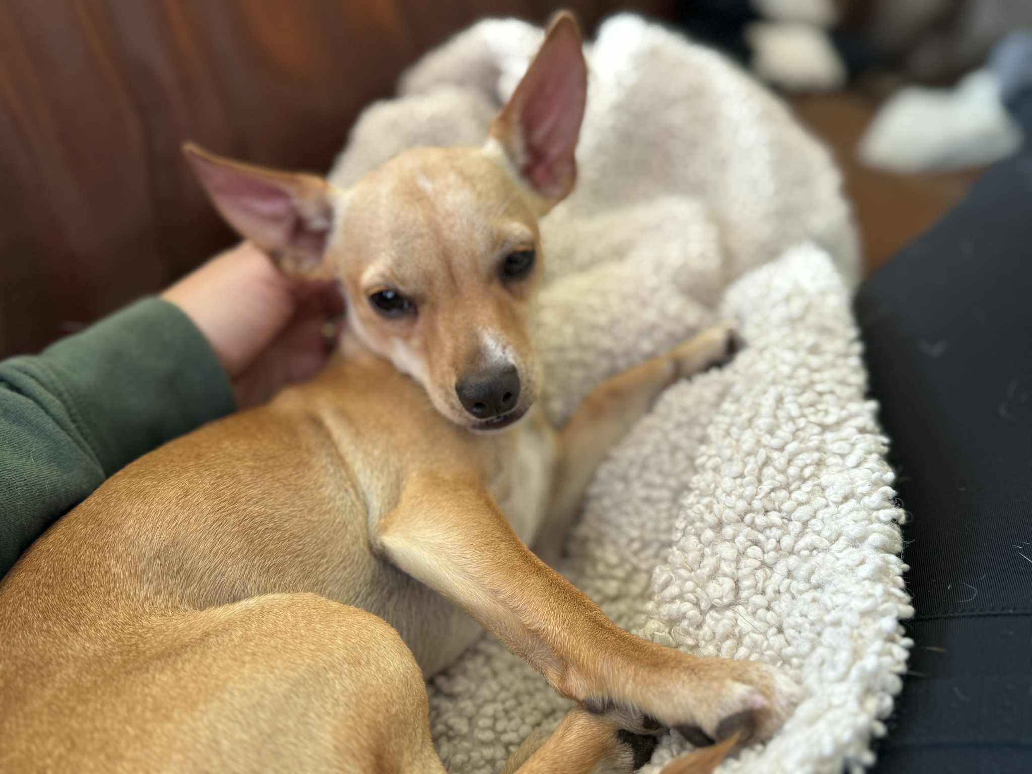 With the ears of Batman and the underbite of Beavis, Dumpling looks suspiciously like Ren from Ren & Stimpy — and his personality matches. One moment, he’s a professional cuddle consultant; the next, he’s a launched pinball ricocheting through the house. By the time you wonder where he went, he’s already boomeranged back to your heels. Highly recommend a bell.