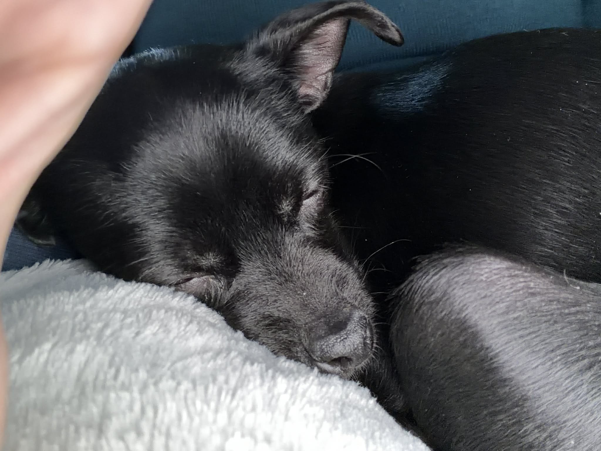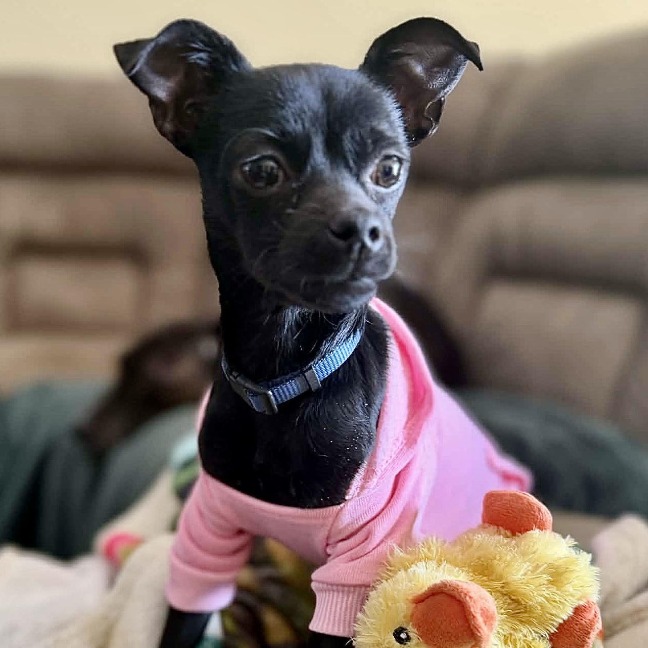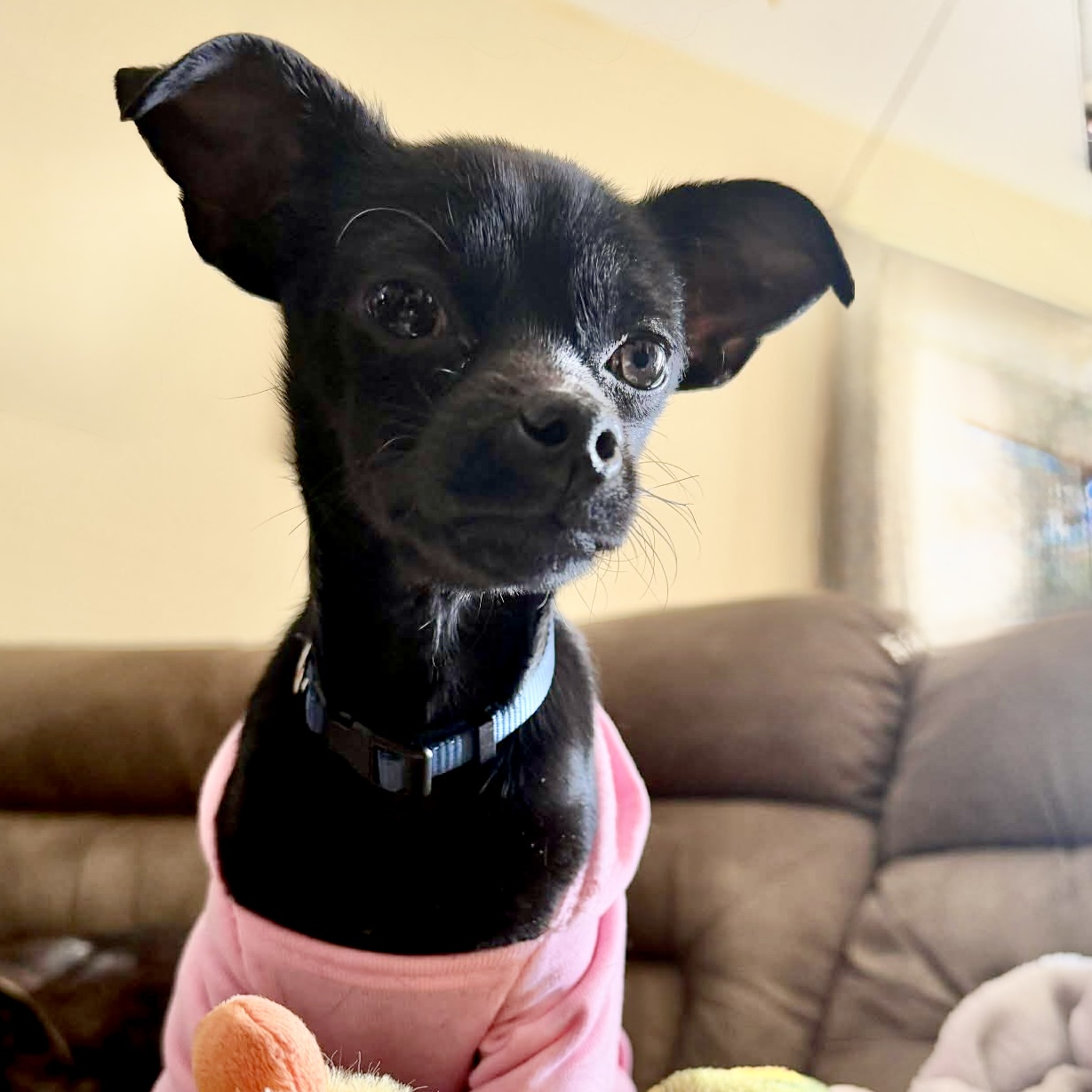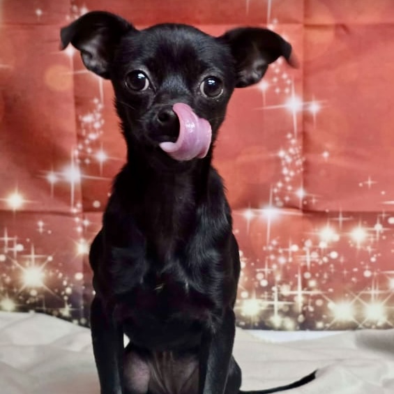Elfie is a sleek, little, beauty with a shiny black coat, long legs, and the heart of a professional snuggler. She adores curling up with her people and is happiest when she can burrow deep into blankets like the cozy queen she is. Sweet, affectionate, and gentle, Elfie brings big love in a tiny package and is ready to be someone’s constant cuddle buddy. Elfie is around 4.5 months old, dog friendly, and 7 lbs.