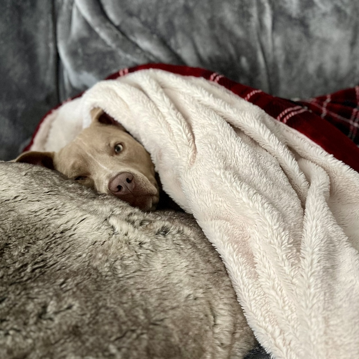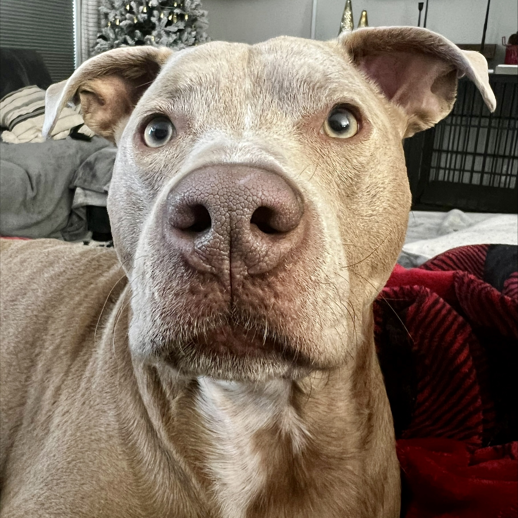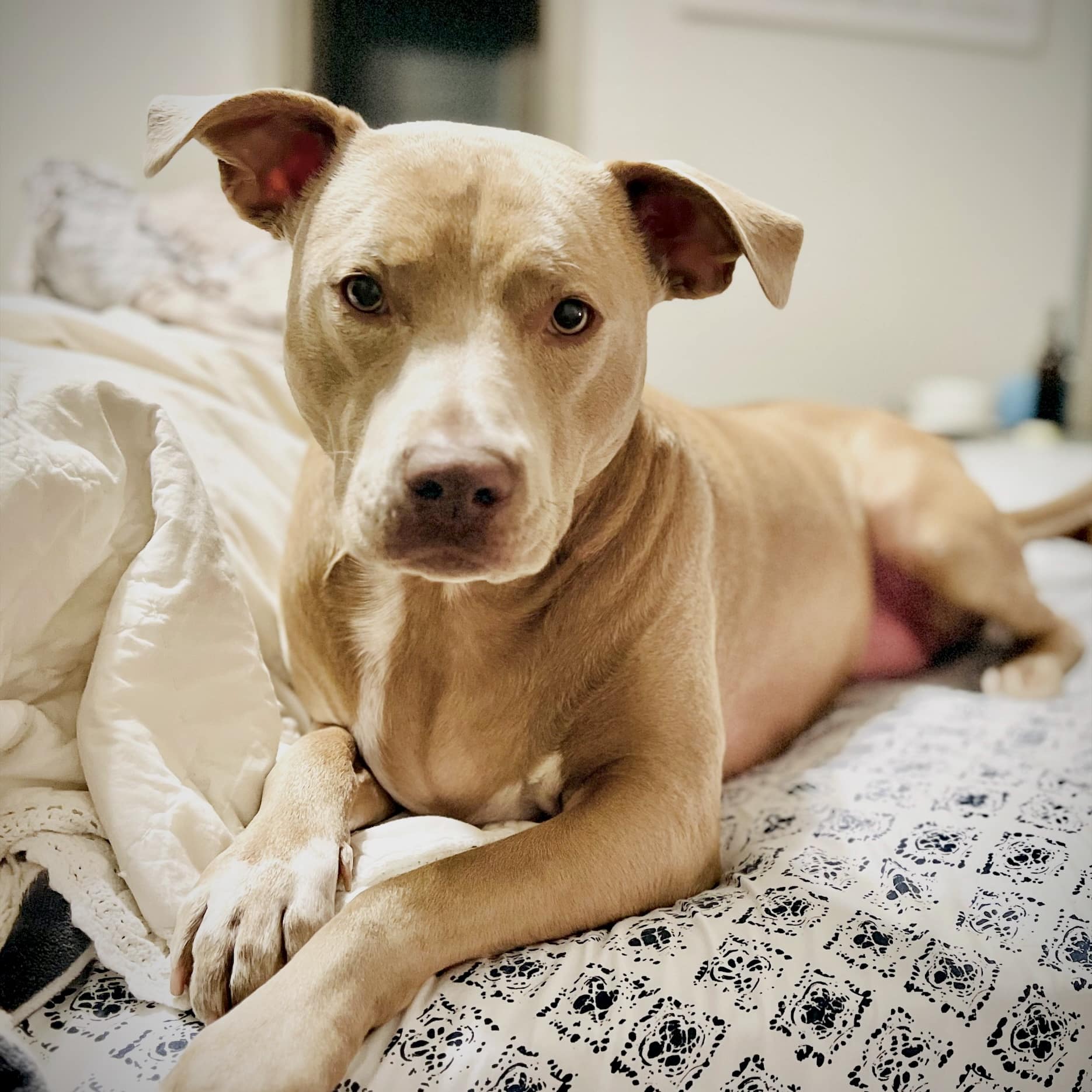 This girl isn’t an athlete — she prefers lounging on the couch, snuggling on a bed or blanket, and staying close to her person. She enjoys bones and treats, but fetch and long outdoor adventures aren’t really her thing. Everest’s greatest joy is simply giving and receiving love while being cozy and comfortable.