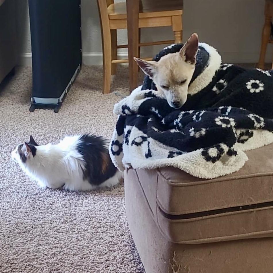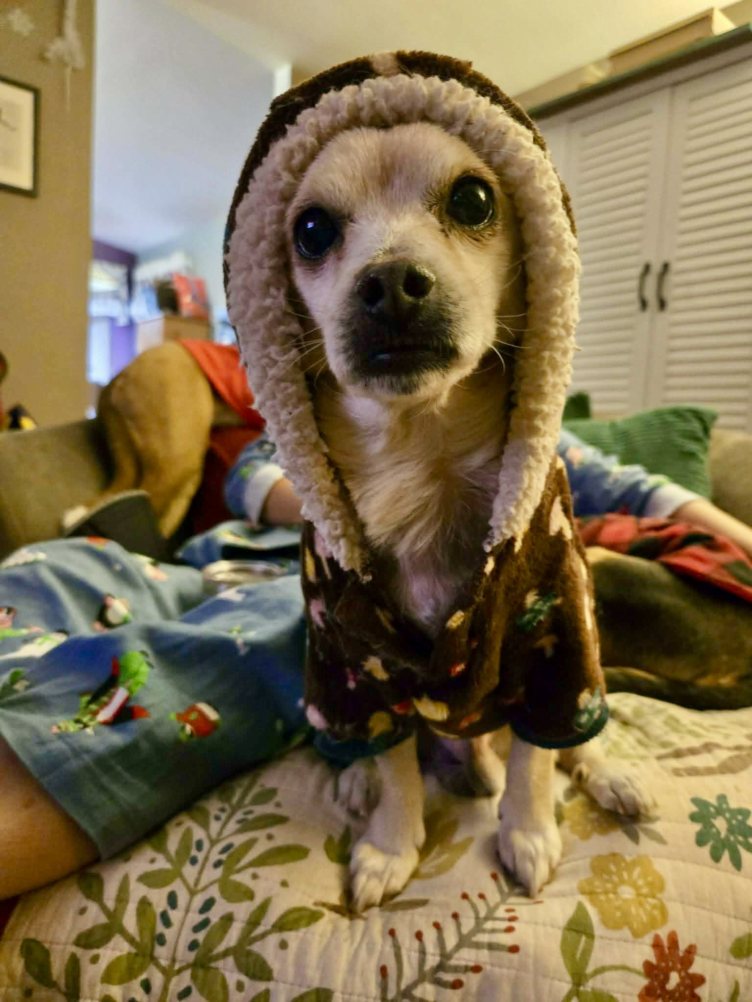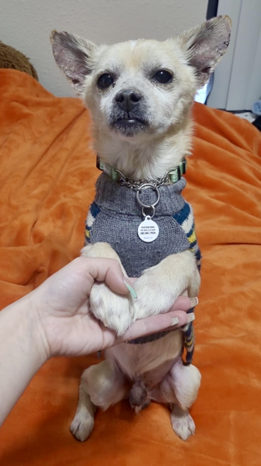 A dog by any other name, just wouldn’t be the same! Fantastic Mr. Fox, referred to as FMF or Fox, is a 6 year old (almost 7) Chihuahua mix. He came to MHCR as a transfer from a local CO shelter in February of 2025. He spent the next 10 months completely kicking our a$$e$ with his allergies and trying to get them under control. AND WE HAVE SUCCEEDED. This guy is, you guessed it, fantastic. He’s been totally worth the effort and we couldn’t be more thrilled to finally list him for his true forever home. He’s on a strict diet and requires daily meds to maintain this luxurious coat and to keep his skin fully intact. Fox is around 12-13 lbs. He loves wearing clothes and fully expects a nice wardrobe from his forever humans. He is great with dogs and cats of all sizes and has proven himself to be house trained. Are you in school? Perfect! He wants to eat your homework. If you aren’t into that you can simply crate him, but be warned, he will protest that a bit in the beginning. Fox likes car rides. He enjoys walks and stroller rides. He’s never met a stranger and is quick to warm up to new peeps he meets. He has bursts of play, but LOVES snuggle time under ALLLLLL the blankets as any good chi should.