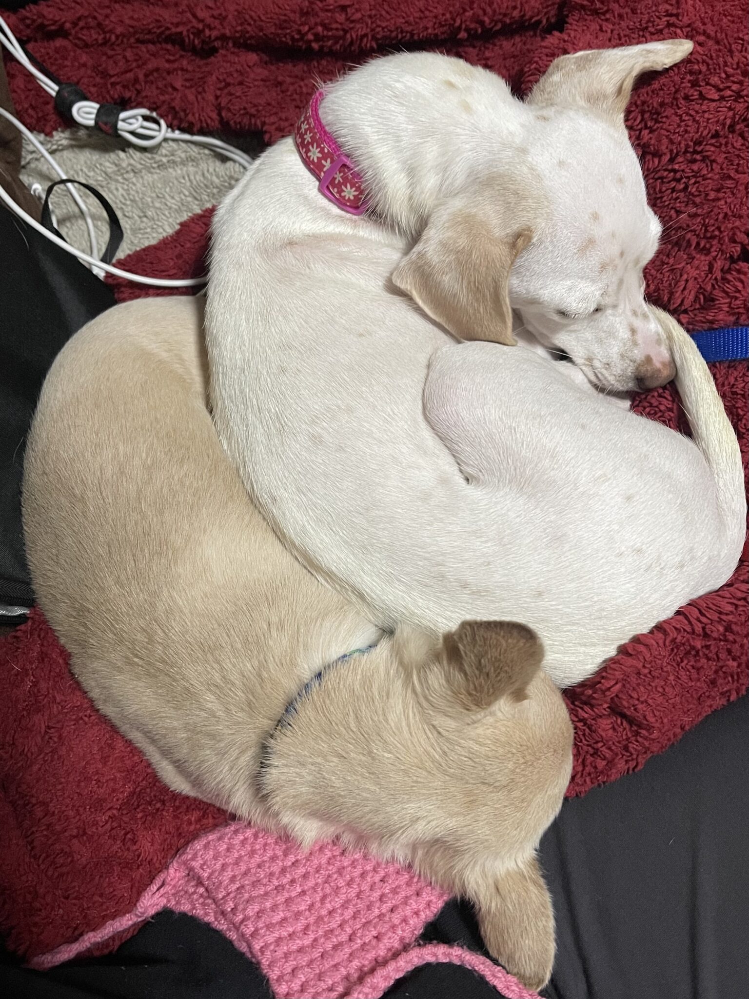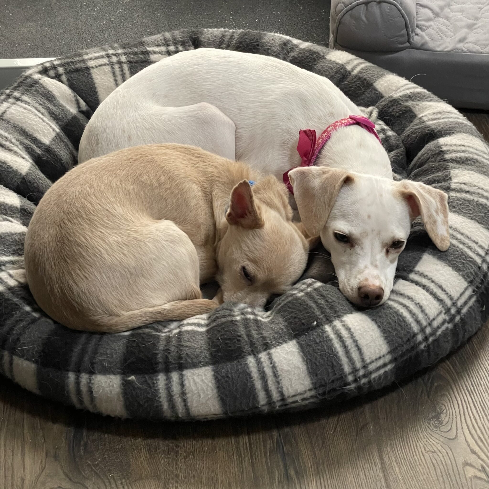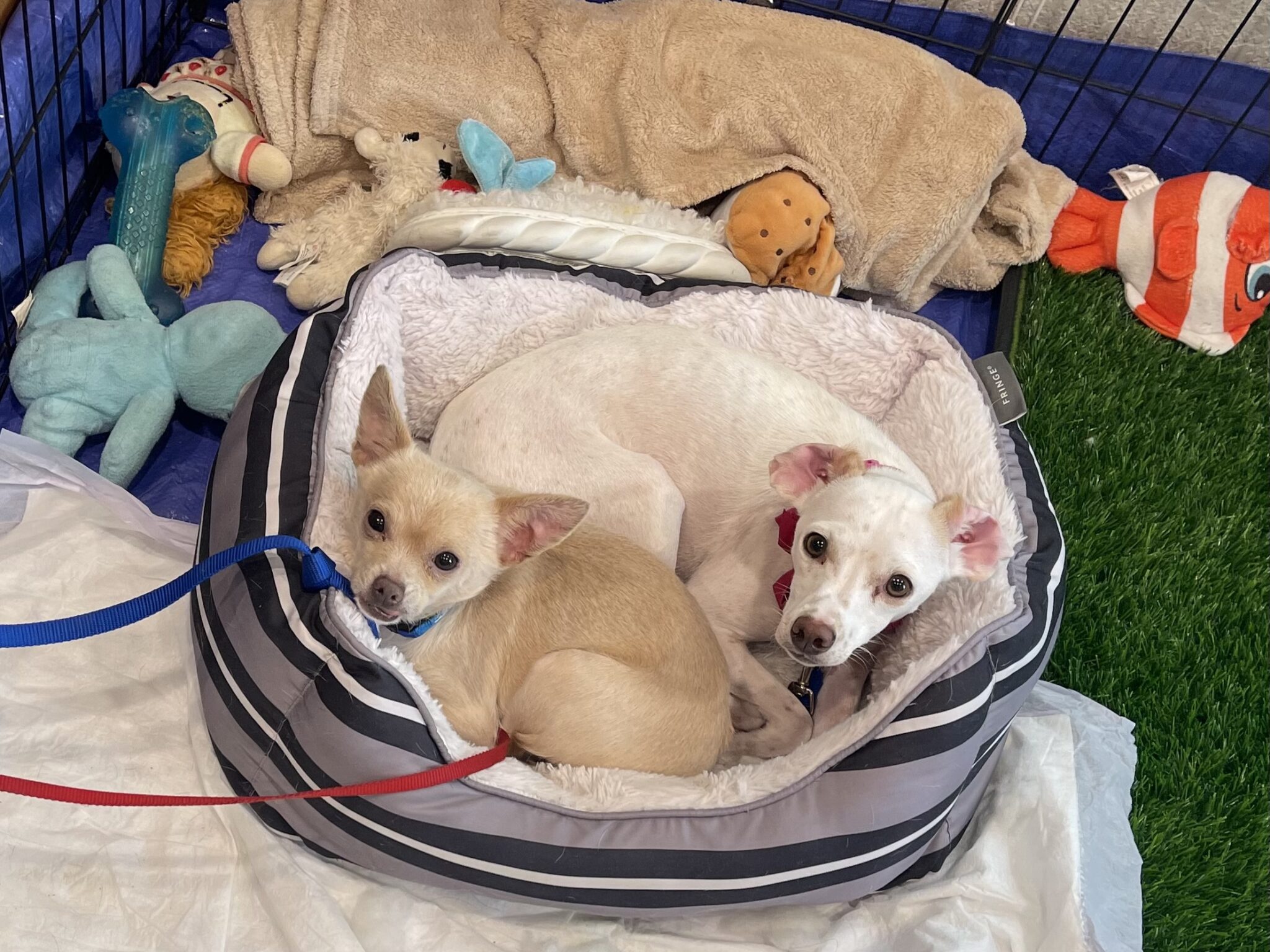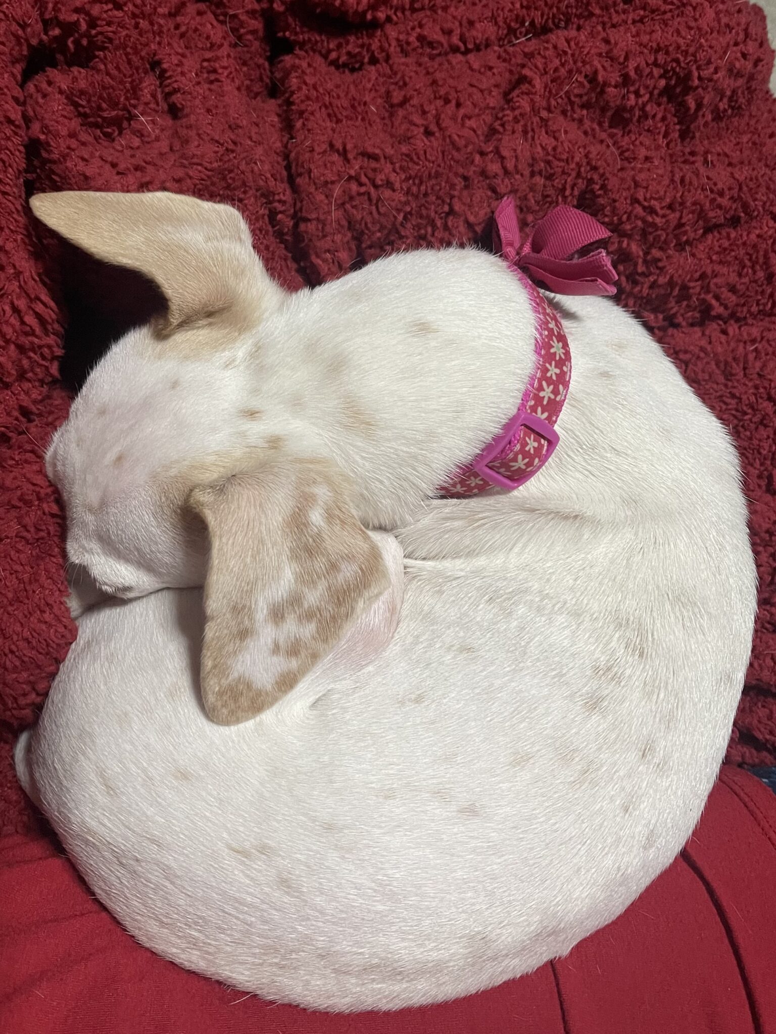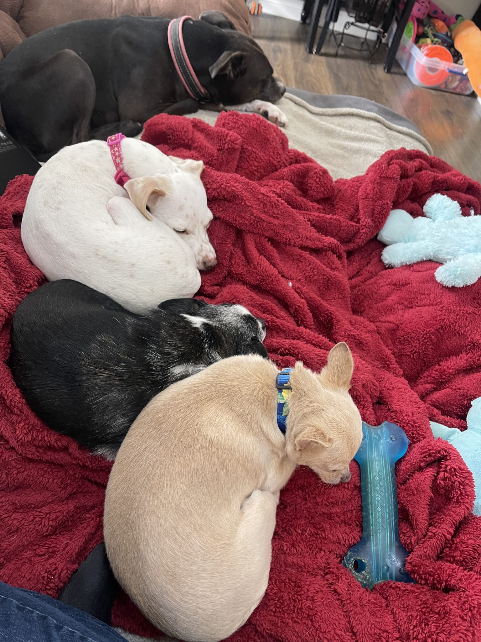 When you’re away, she is perfectly content relaxing in her dog pen or on the couch. When you’re home, you can expect lots of snuggles with her dog friends and trusted humans, fun spurts of play with dogs and toys, and the sweetest little kisses you’ll ever receive.