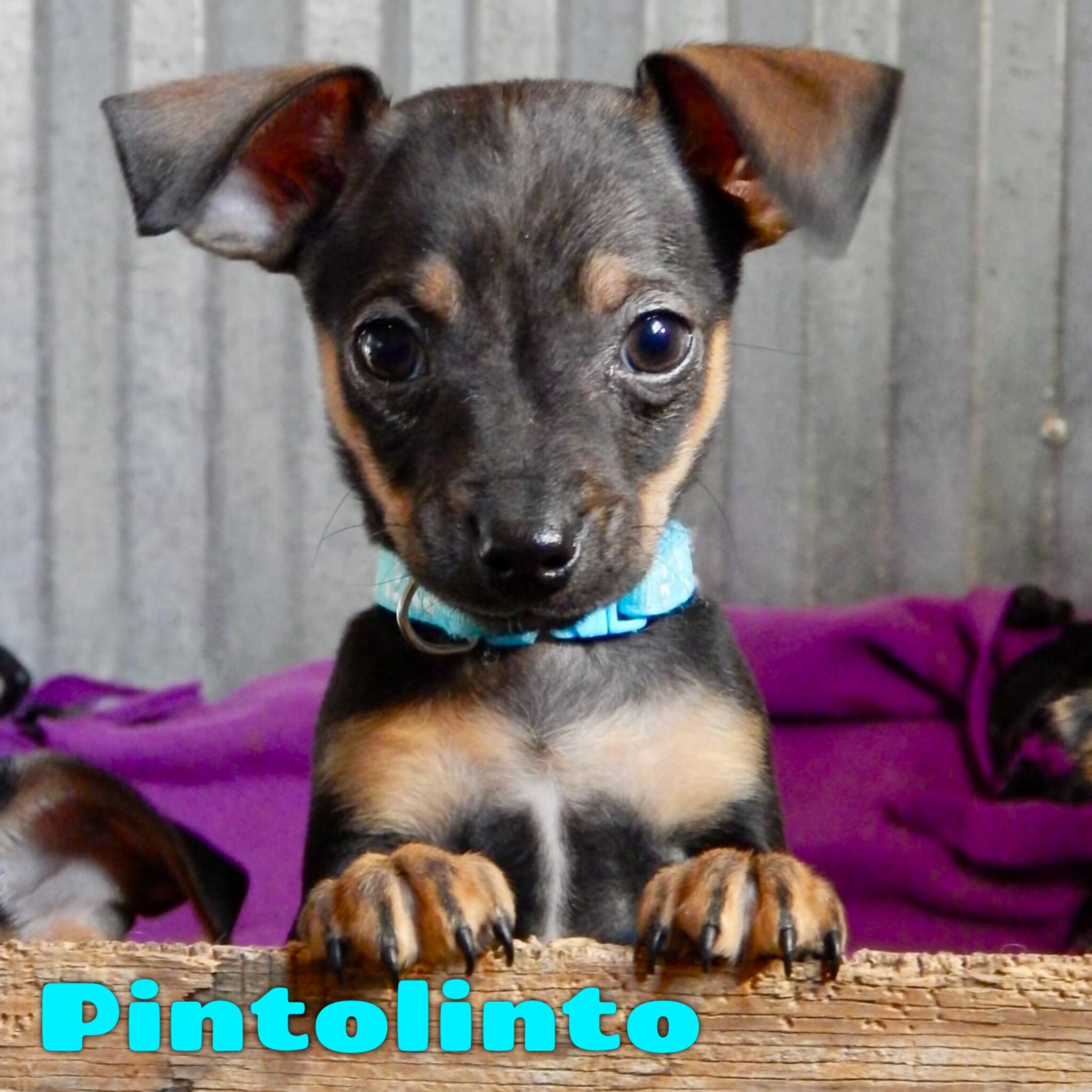 Pintolinto is a 9 week old, male, Chiweenie! He has schmedium length legs with an adorable long body and ears that can’t figure out which way is up. Pinto is very sweet and cuddly. He also loves to zip around the yard and play with his canine friends. He’s really fast! Pinto will make a great addition to a variety of homes! He’s presently just under 4 lbs.