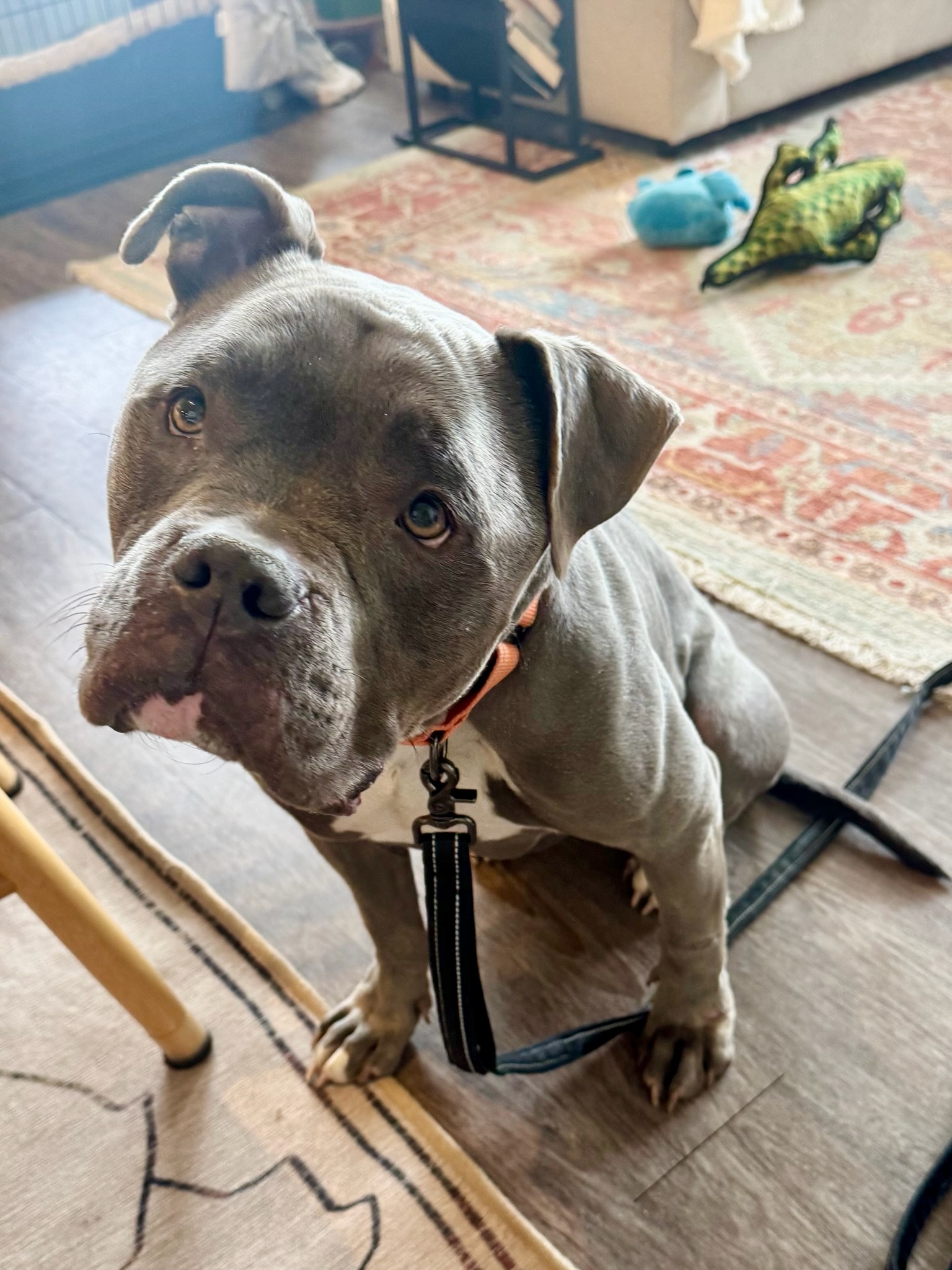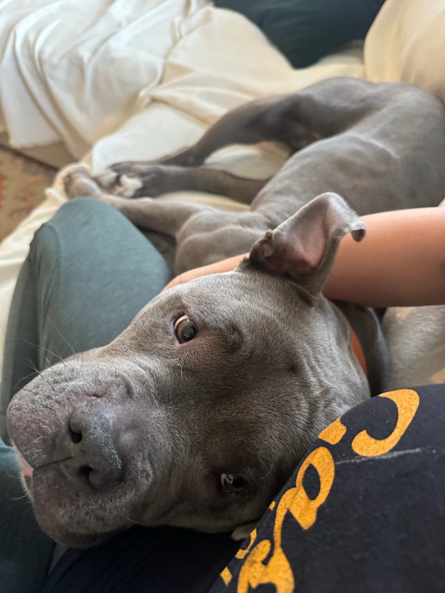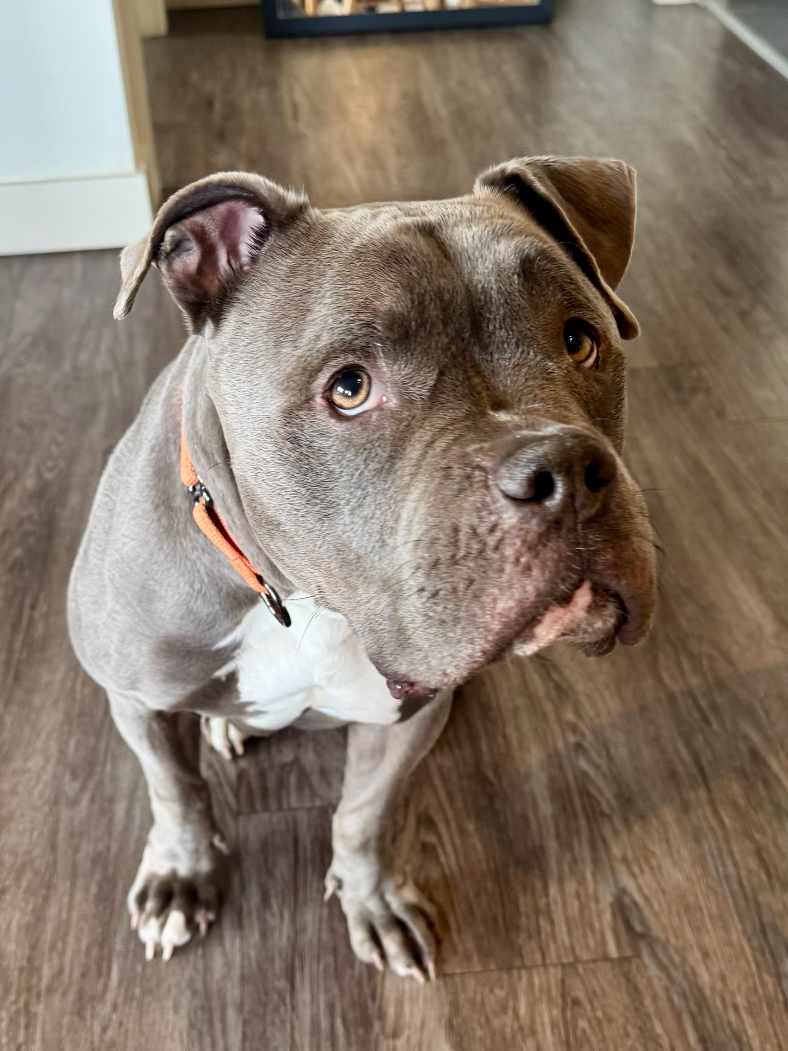Max is a 4-year-old American Staffordshire mix with a handsome blue-gray coat, a big watermelon head, and soulful, expressive eyes. At 68 lbs of solid muscle (his head is easily 35 lbs of that), he’s an athletic, powerful dog with a truly soft heart.