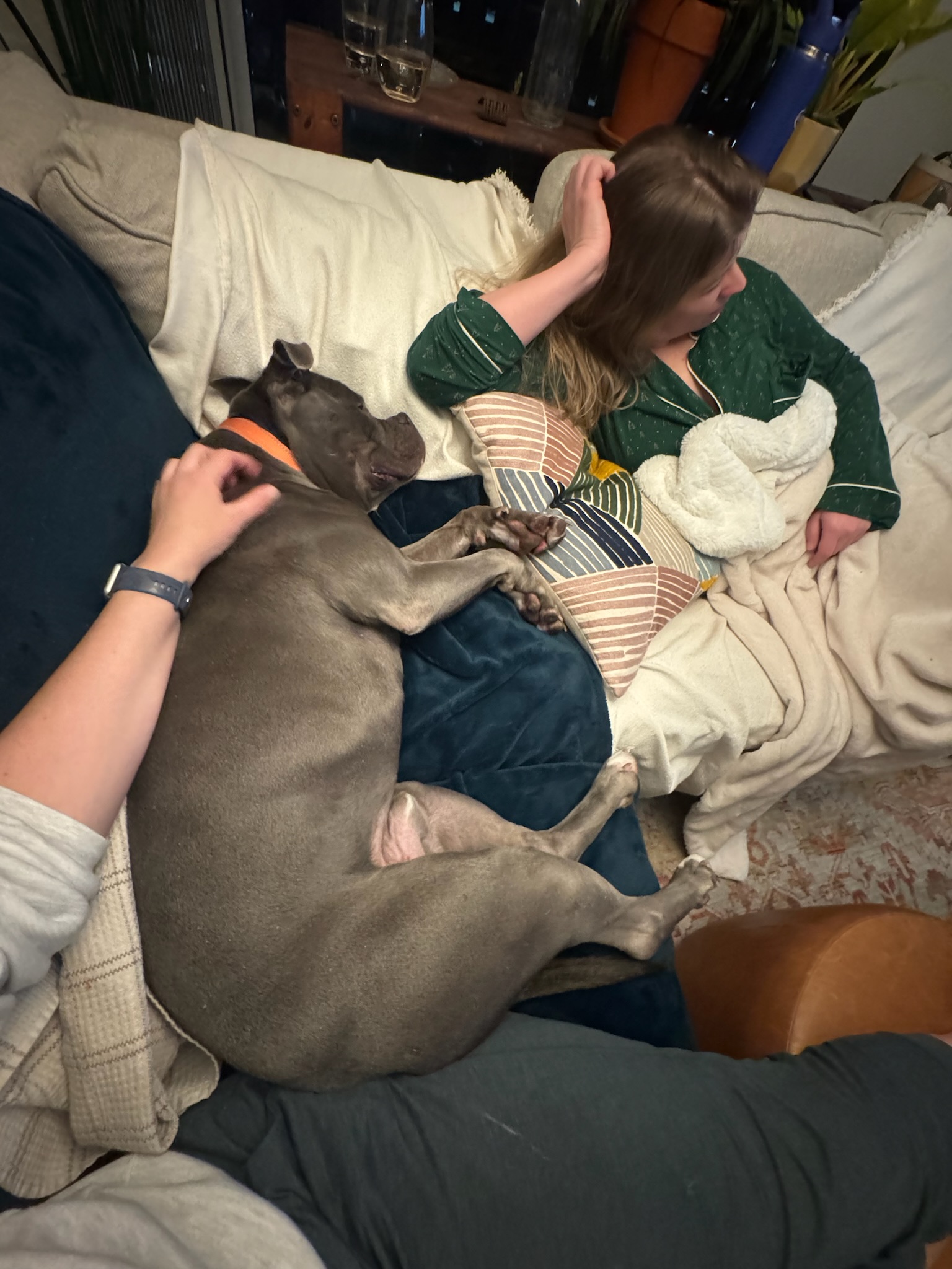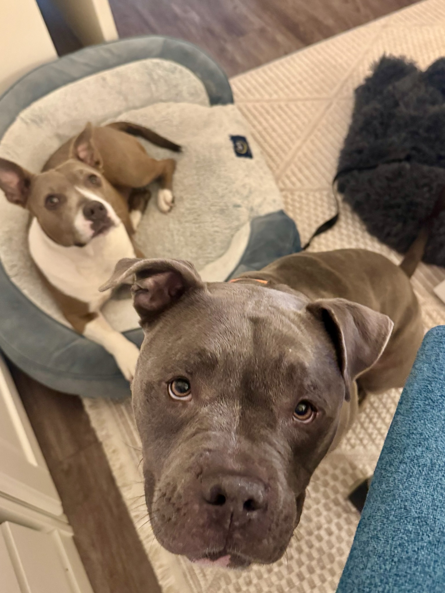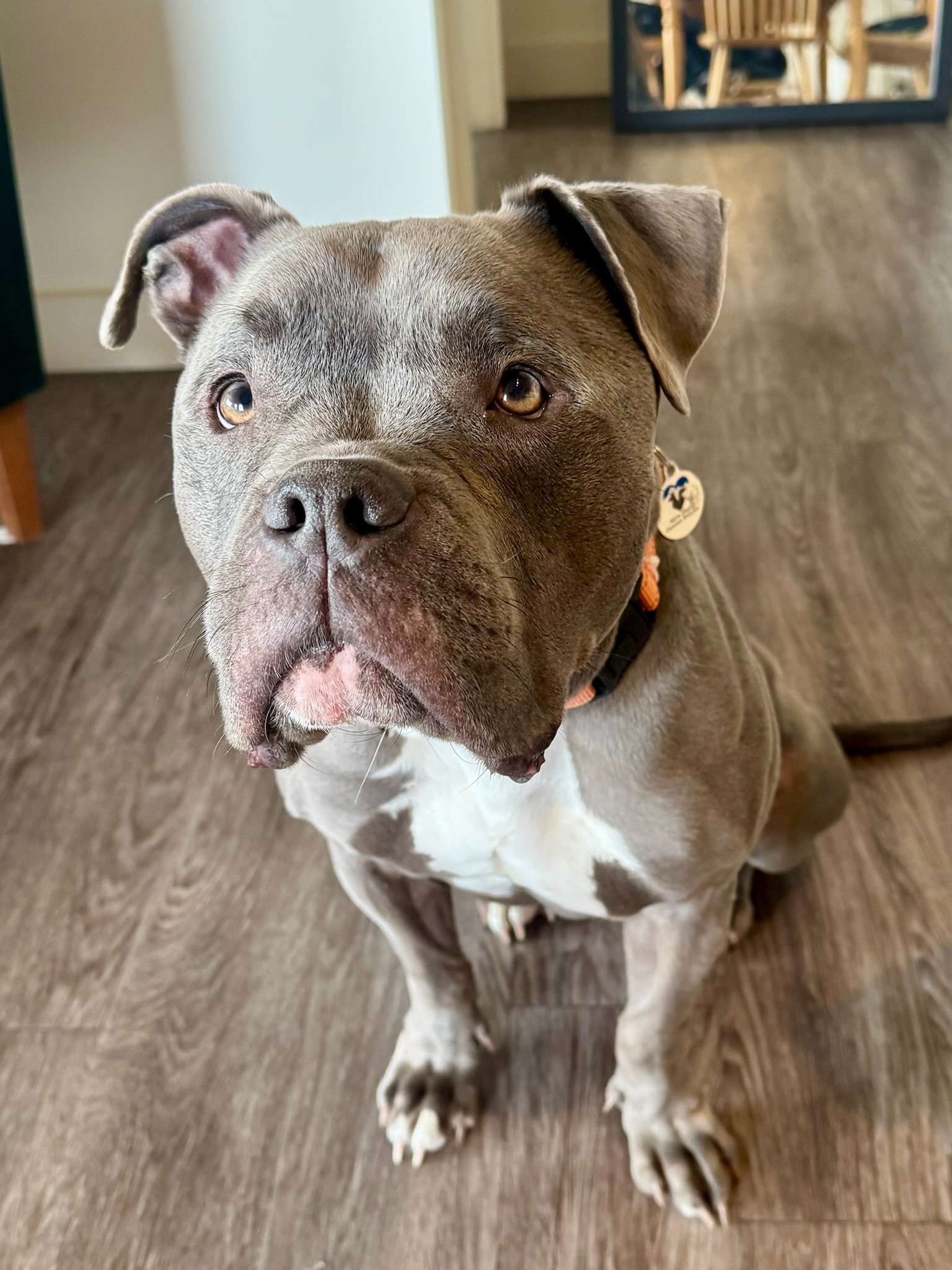 Max is a 4-year-old American Staffordshire mix with a handsome blue-gray coat, a big watermelon head, and soulful, expressive eyes. At 68 lbs of solid muscle (his head is easily 35 lbs of that), he’s an athletic, powerful dog with a truly soft heart.