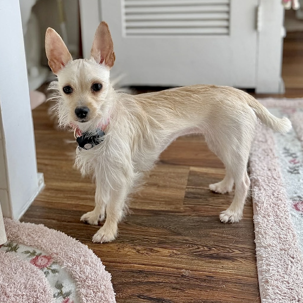 Minnie does well with other dogs but doesn’t need one in her home—she’s happy as long as she has her humans. She’s trusted with free roam and is doing great learning the dog door while continuing to make progress with potty training. She’s also getting more comfortable settling in her room or crate when left alone.