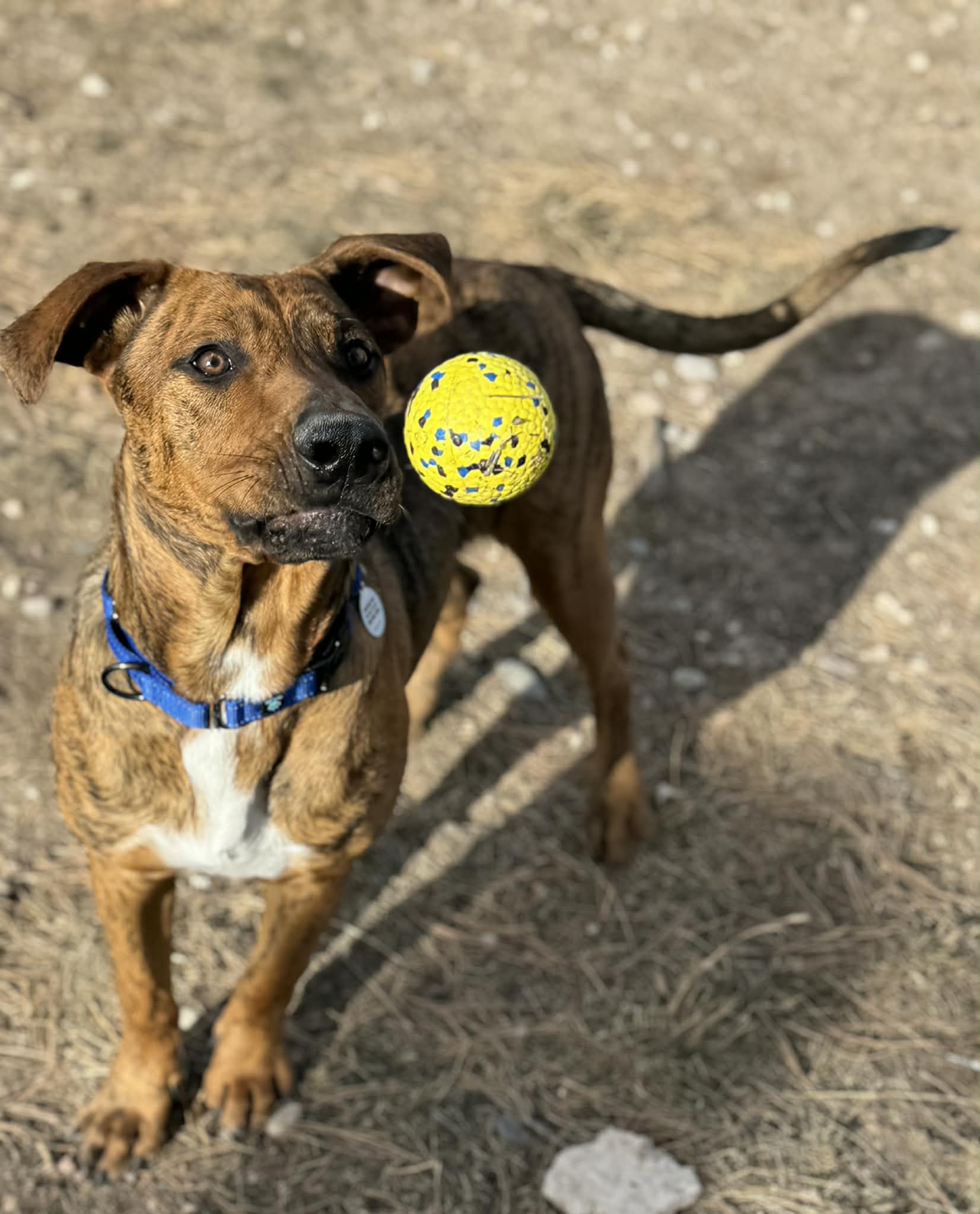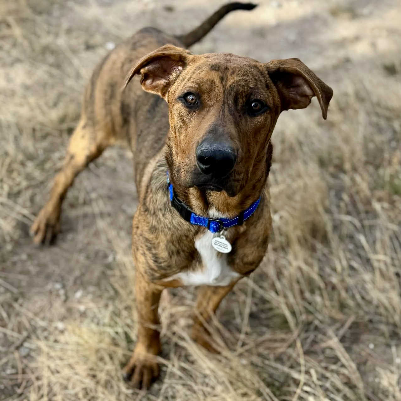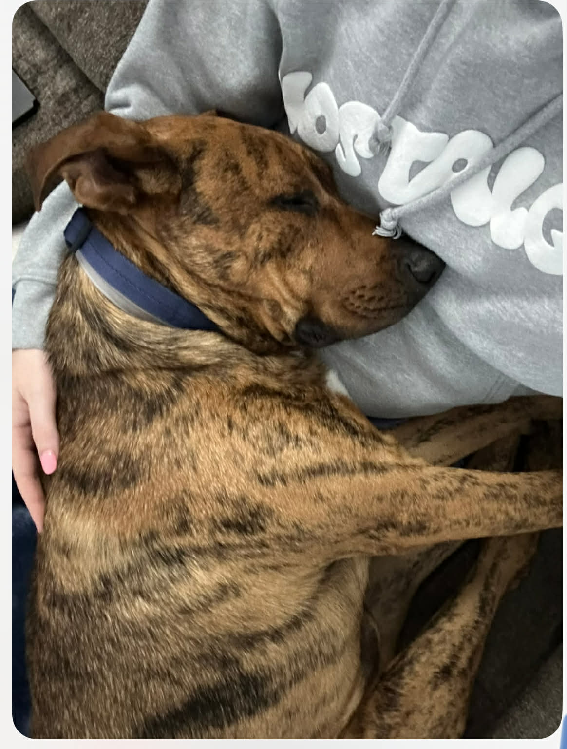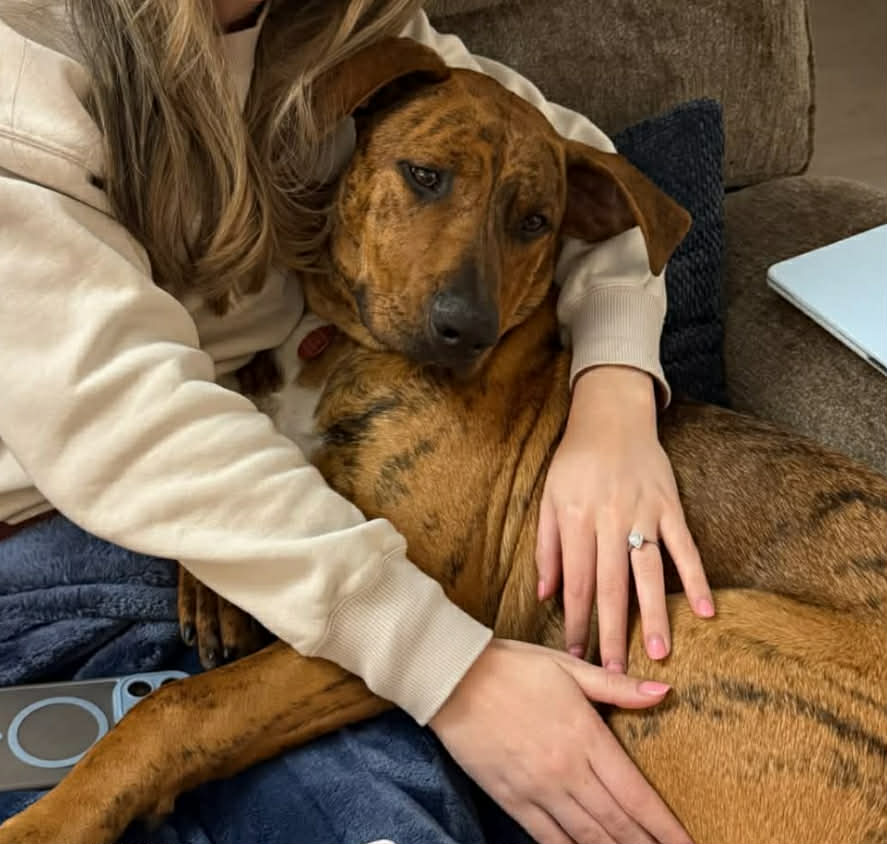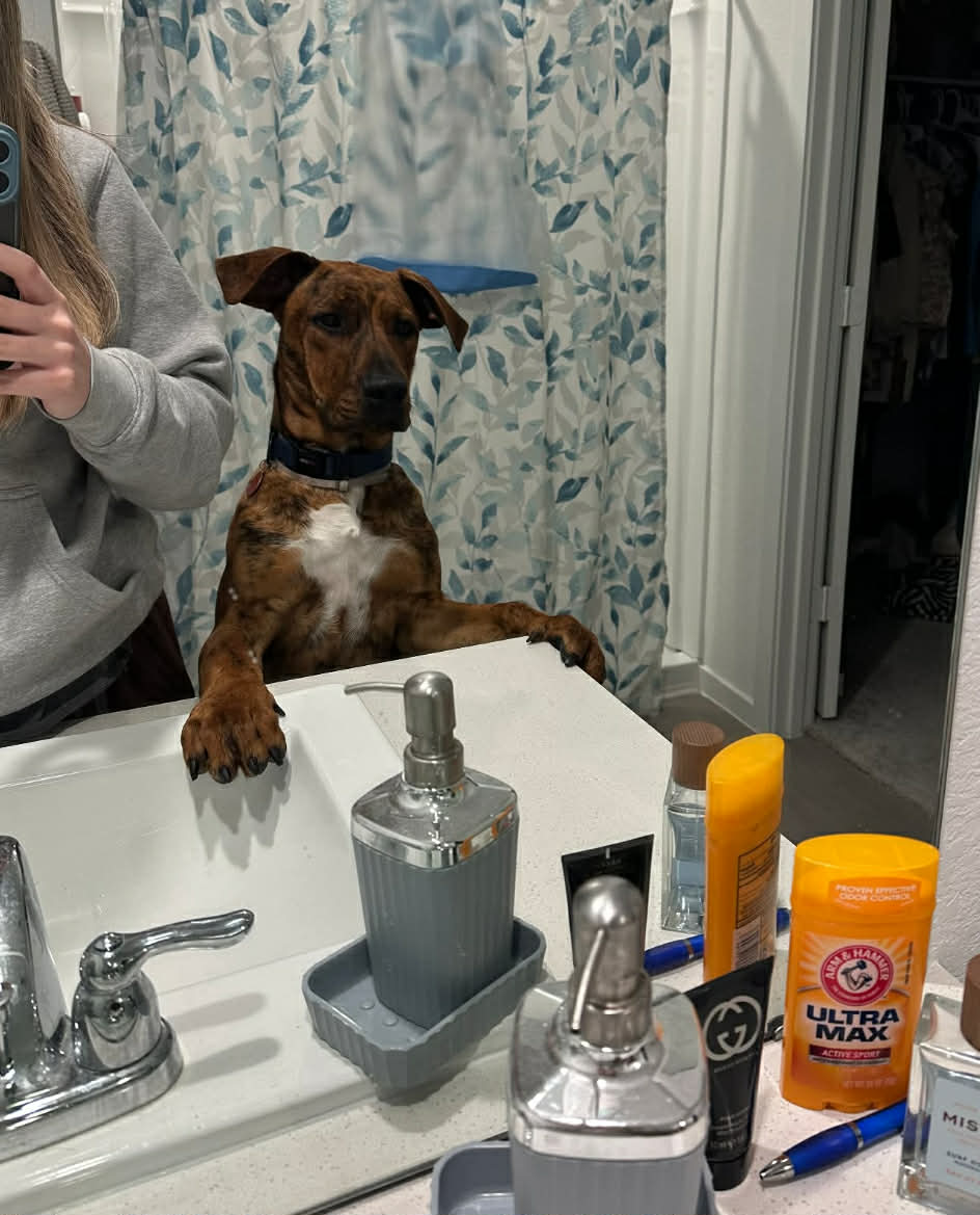 Nick is 72 lbs and we think he’s around a year old. He’s derpy and we suspect he’s a Great Dane/Lab mix. Nick is a happy, affectionate boy who loves toys, naps, and—most of all—snuggles and forehead kisses. His tail never stops wagging; he’s truly the happiest pup. In just two short days, he learned to sit and shake, rides perfectly in the car (he just curls up and relaxes in the back), walks great on a leash right by your side, is fully potty trained (not one accident!), and does great in his kennel. Nick also loves playing fetch in the backyard—he could chase a ball for hours! Words can’t fully capture how sweet and gentle this boy is. He is also dog friendly and deserves the best from here on out so please apply for Nick! His sweet, sensitive self will continue to blossom in his forever home.