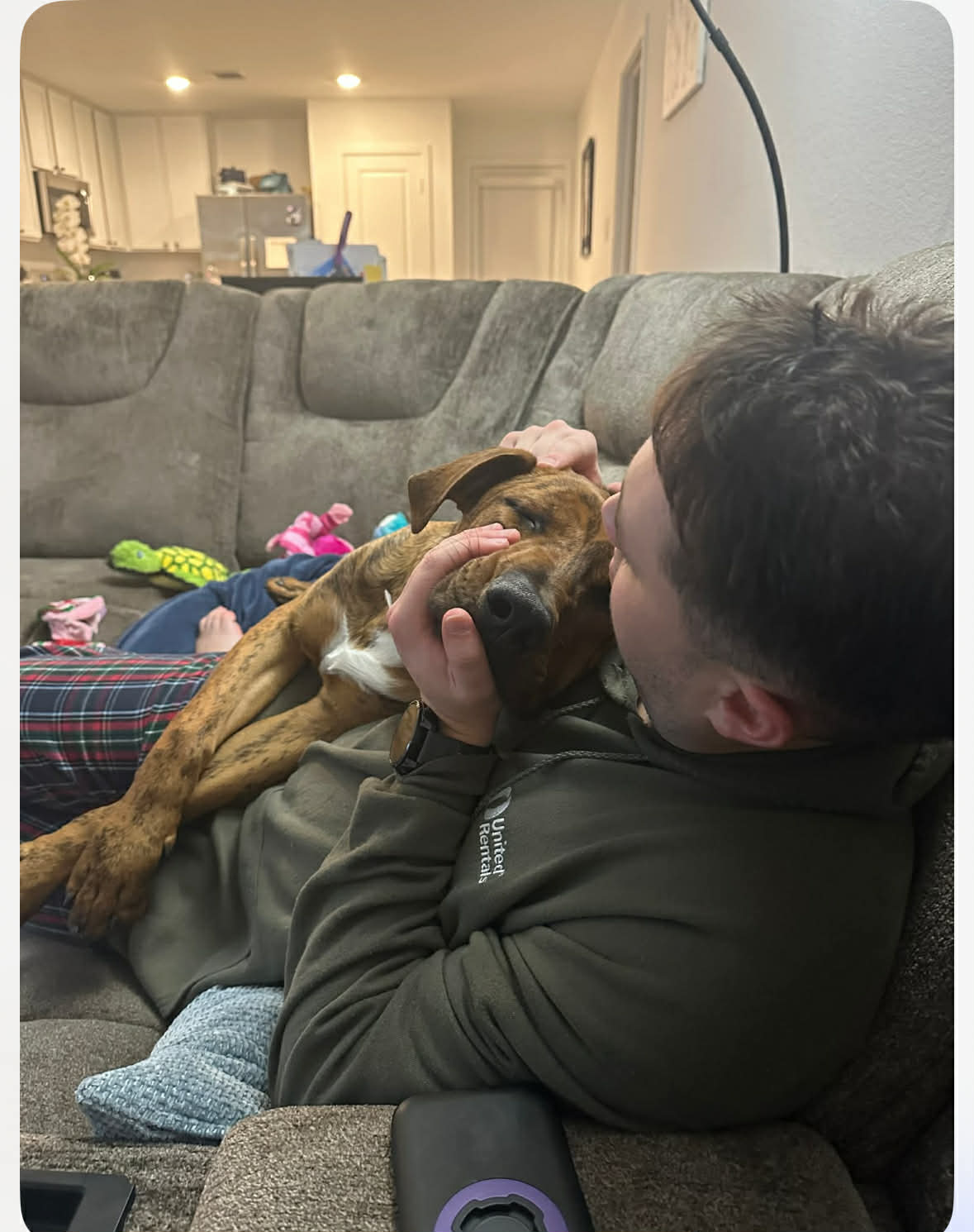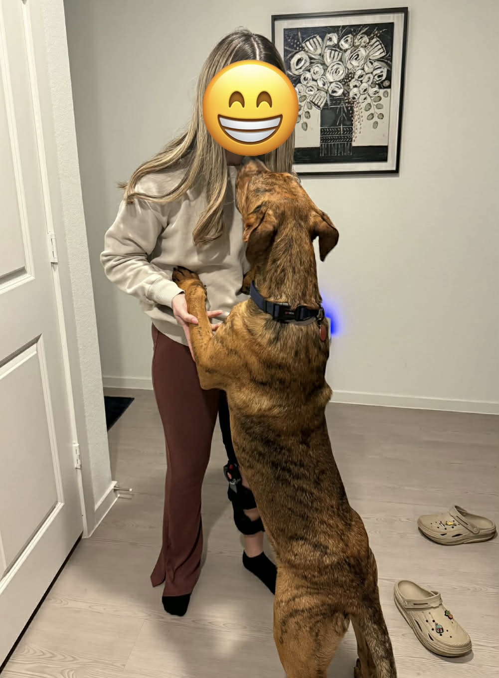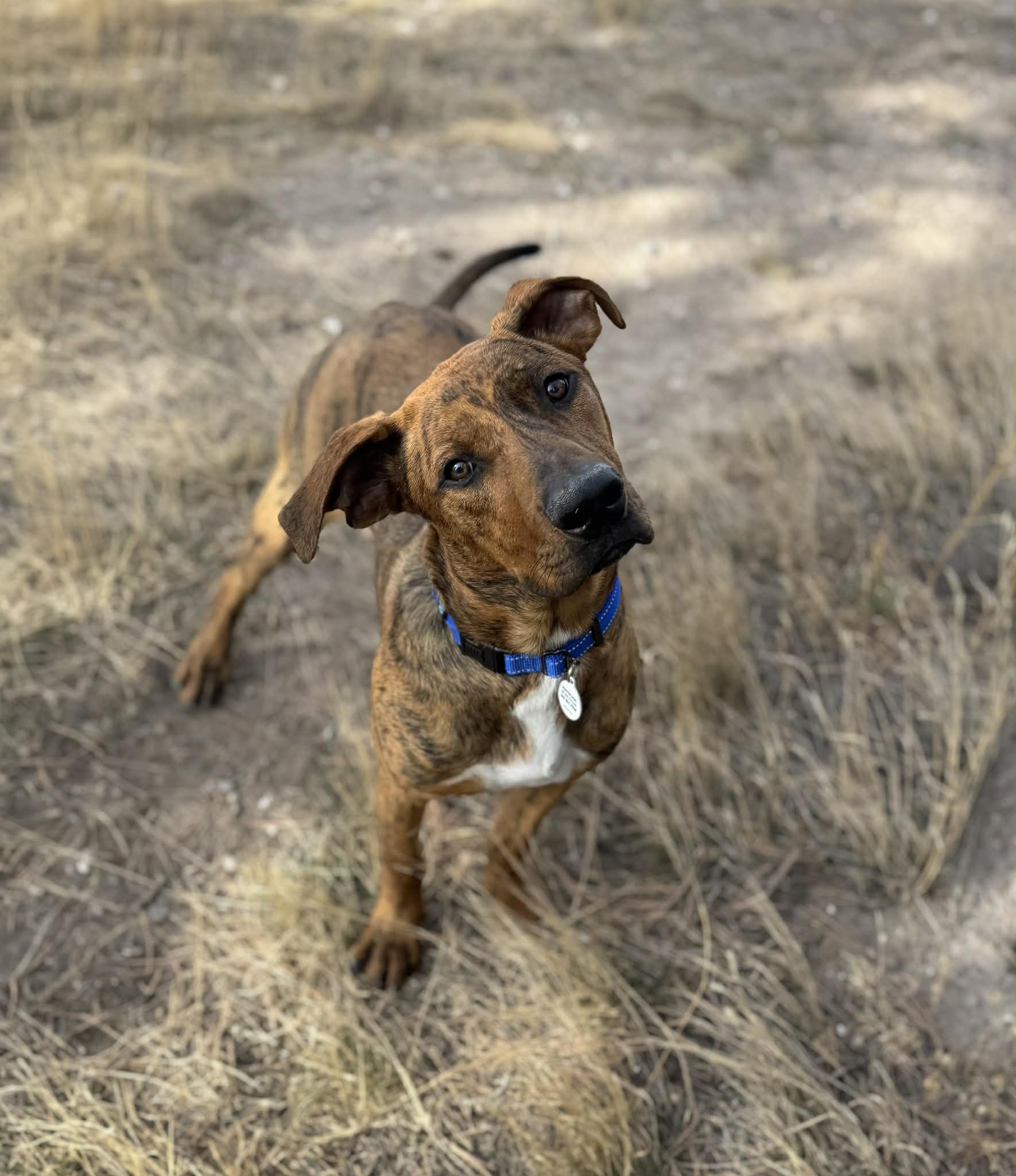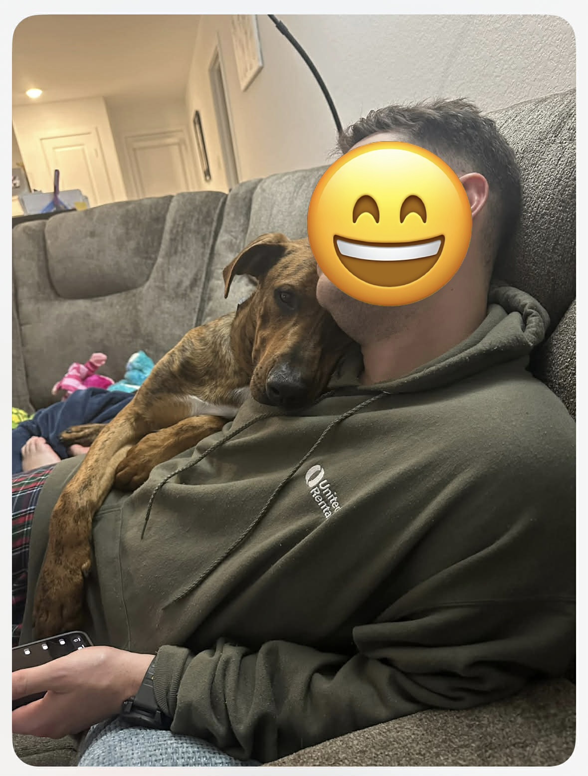 Nick is 72 lbs and we think he’s around a year old. He’s derpy and we suspect he’s a Great Dane/Lab mix. Nick is a happy, affectionate boy who loves toys, naps, and—most of all—snuggles and forehead kisses. His tail never stops wagging; he’s truly the happiest pup. In just two short days, he learned to sit and shake, rides perfectly in the car (he just curls up and relaxes in the back), walks great on a leash right by your side, is fully potty trained (not one accident!), and does great in his kennel. Nick also loves playing fetch in the backyard—he could chase a ball for hours! Words can’t fully capture how sweet and gentle this boy is. He is also dog friendly and deserves the best from here on out so please apply for Nick! His sweet, sensitive self will continue to blossom in his forever home.