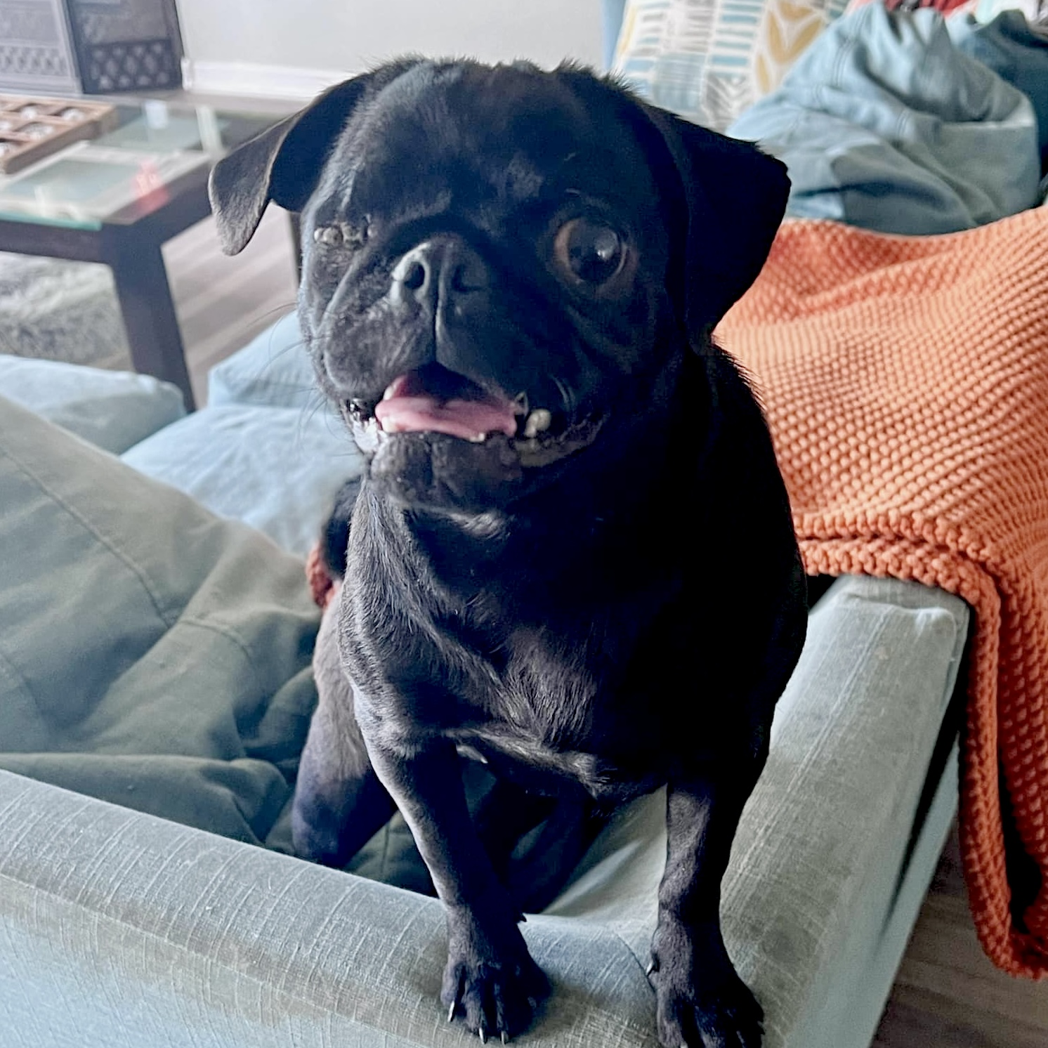 Bug’s personality is absolutely one-of-a-kind. She has a little obsession with smelling people’s chins as her way of saying hello and showing affection. She also has a hilariously stubborn belief that once she’s on a chair, she cannot get off without help. Her foster family has learned to anticipate this dramatic moment, which never fails to make them laugh. Every day with Bug brings a new funny little quirk that keeps everyone smiling.
