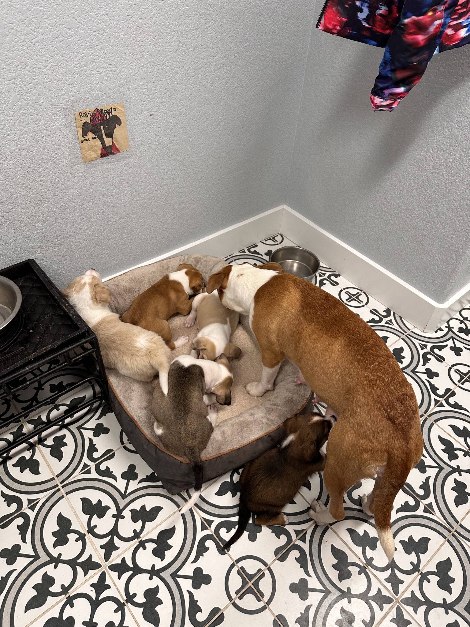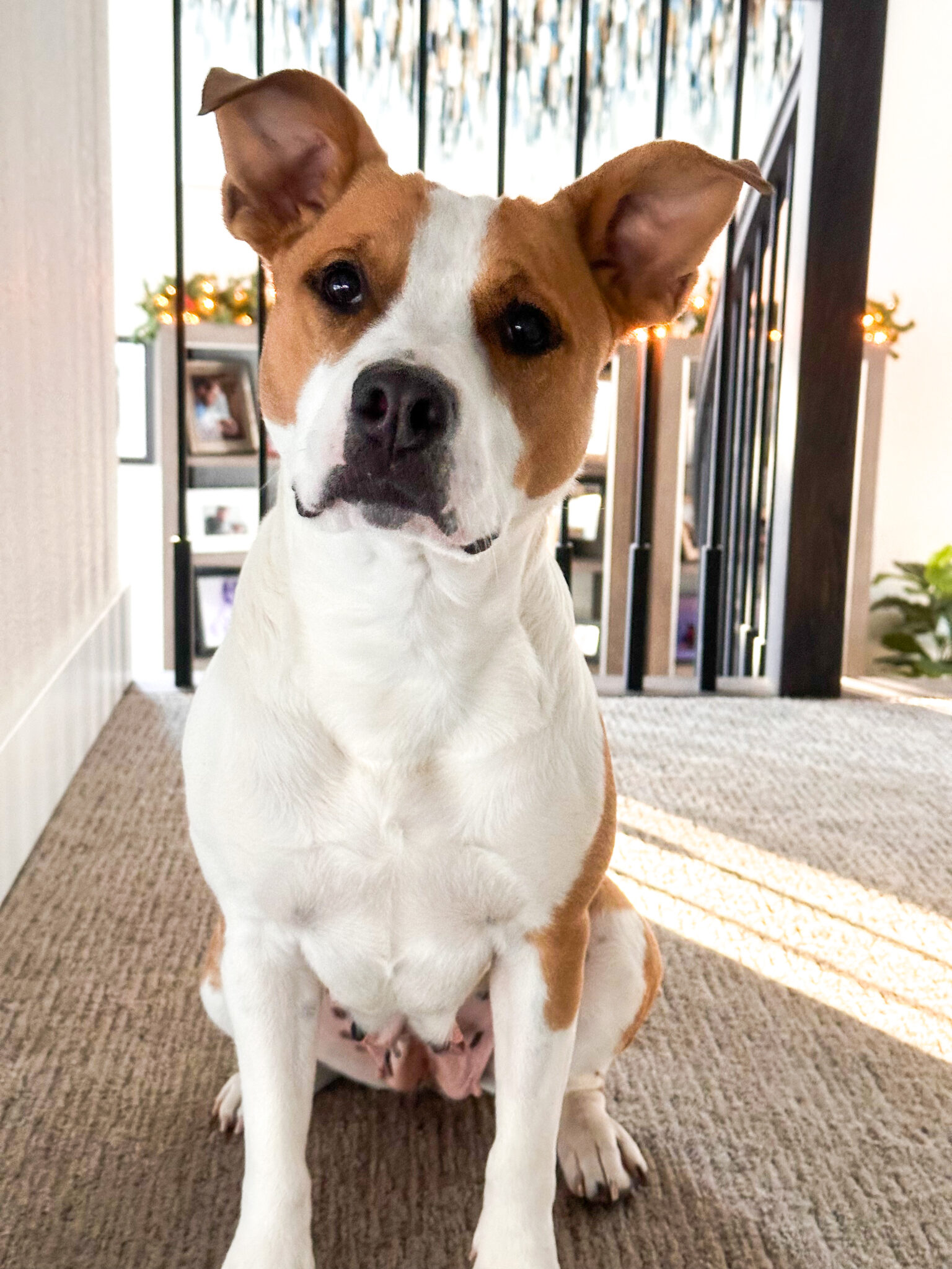 I am 45lbs and kinda a low rider with shorter front legs. My foster mom says it is adorable watching me run to her because of my shorter legs. I have a medium length coat. One of my puppies got their DNA tested and the result for the mother dog came back as Staffordshire terrier mix.