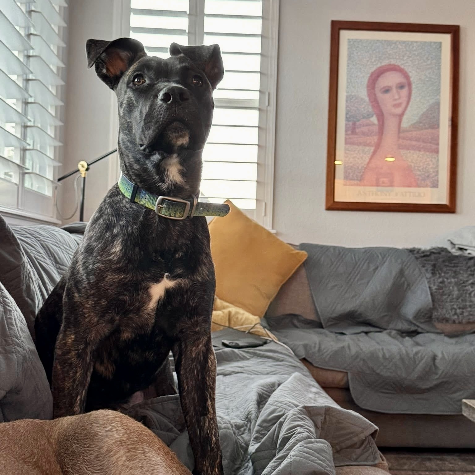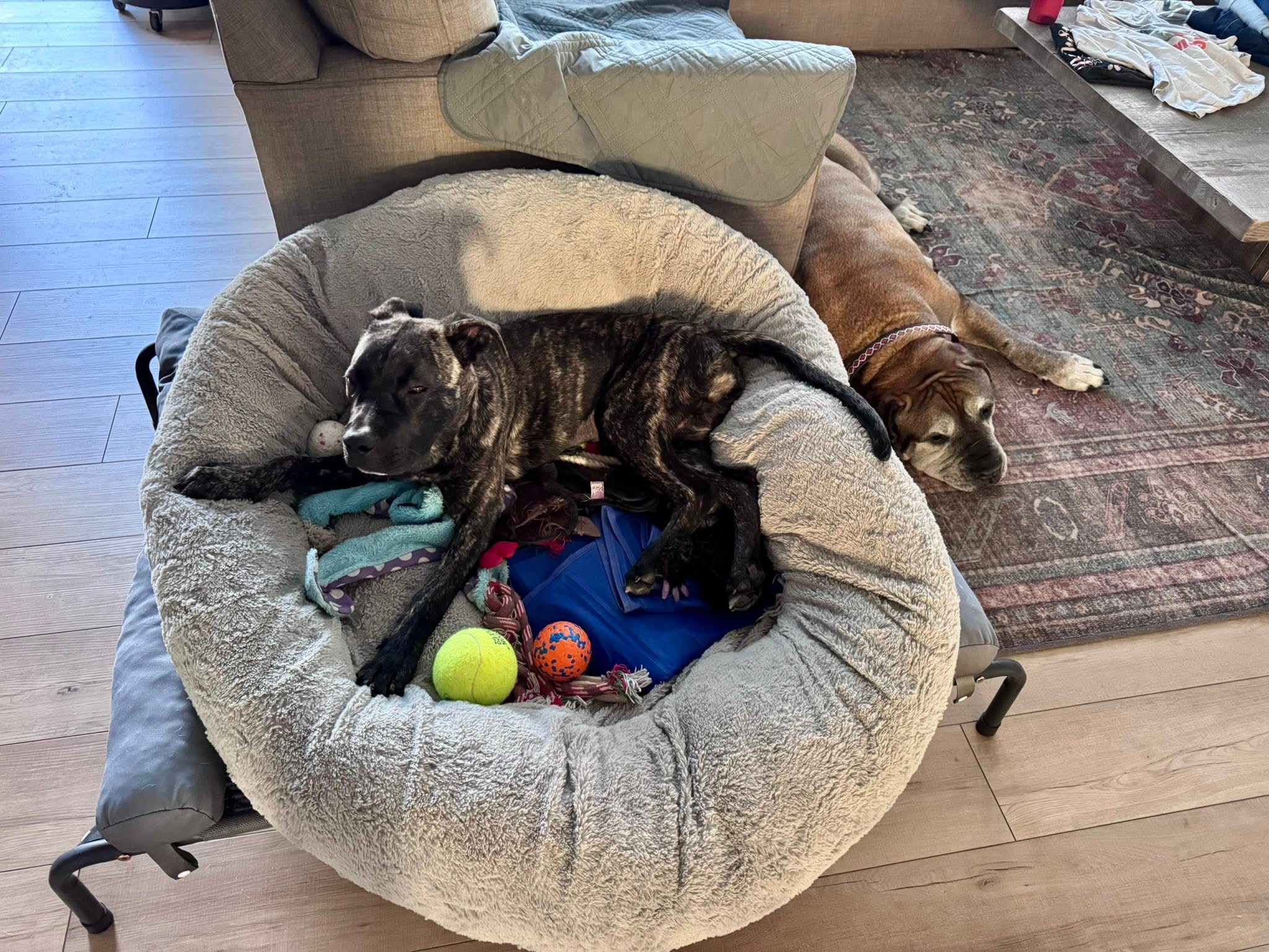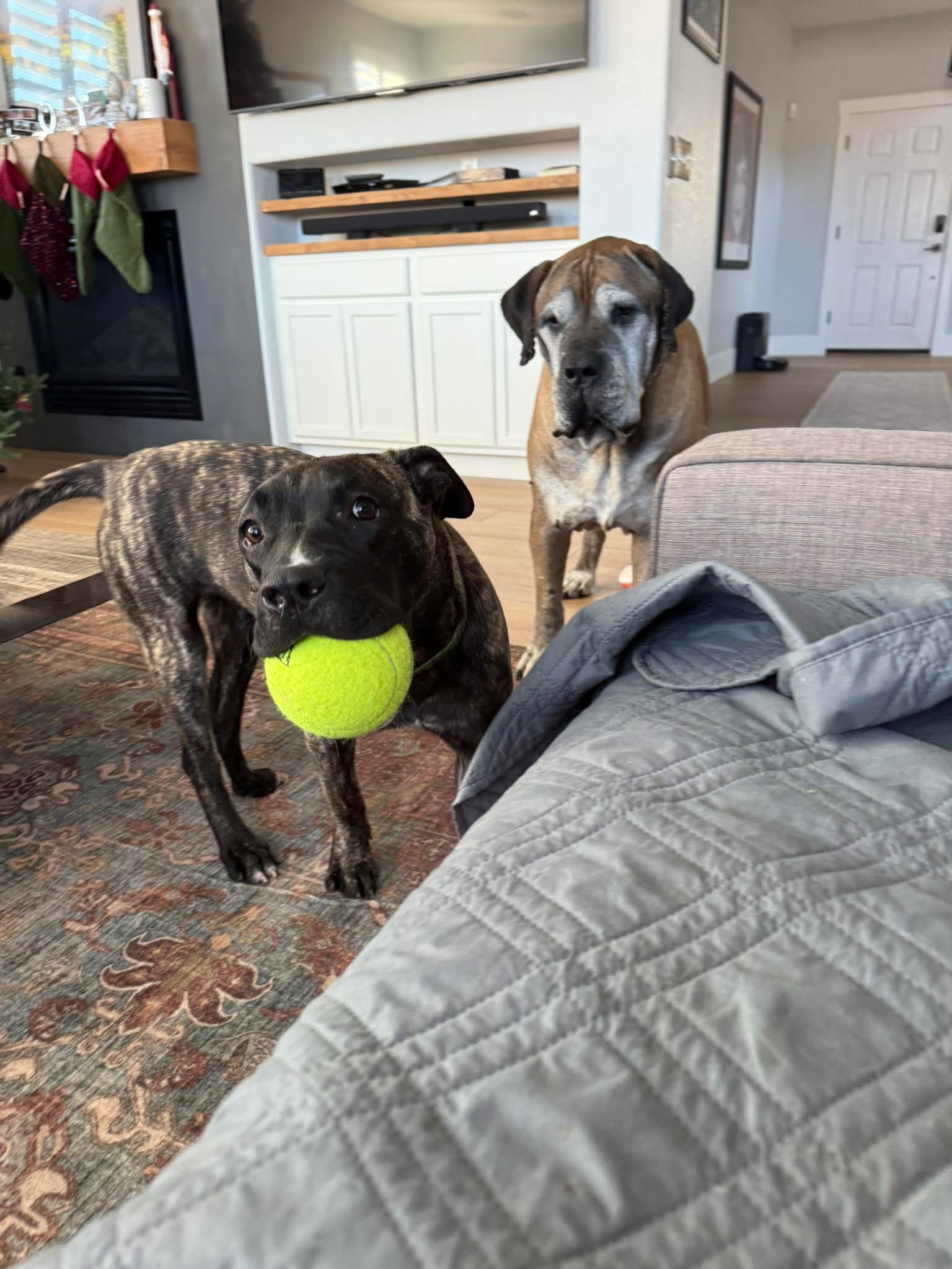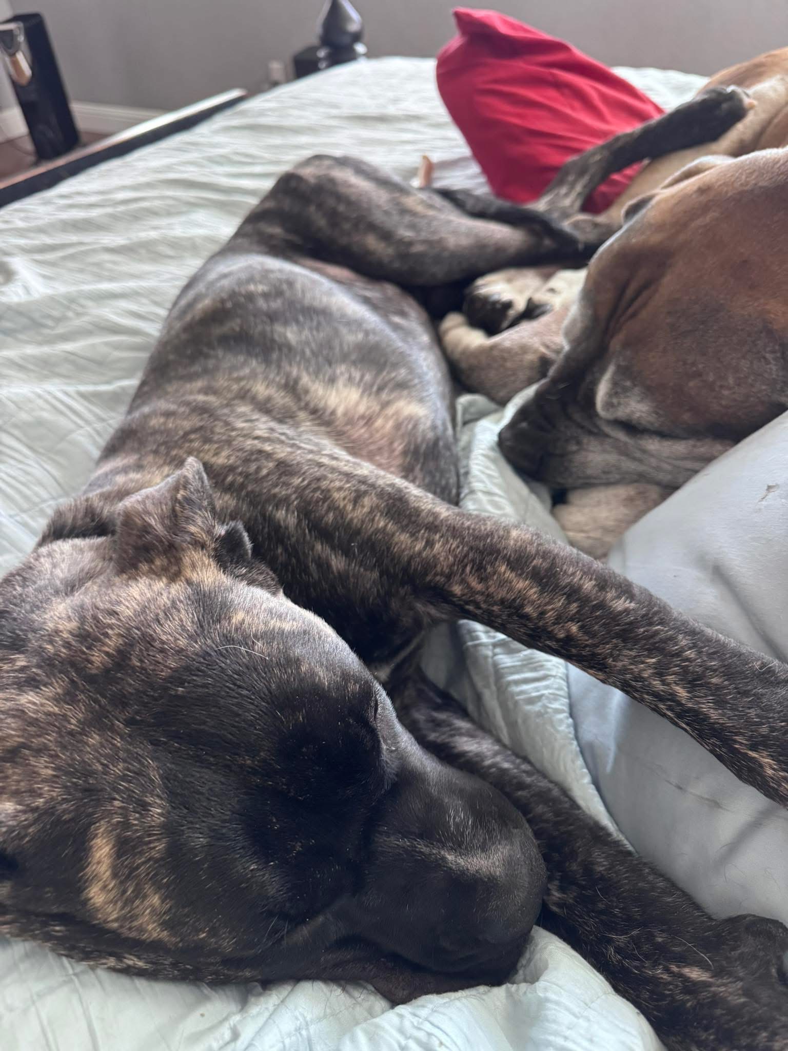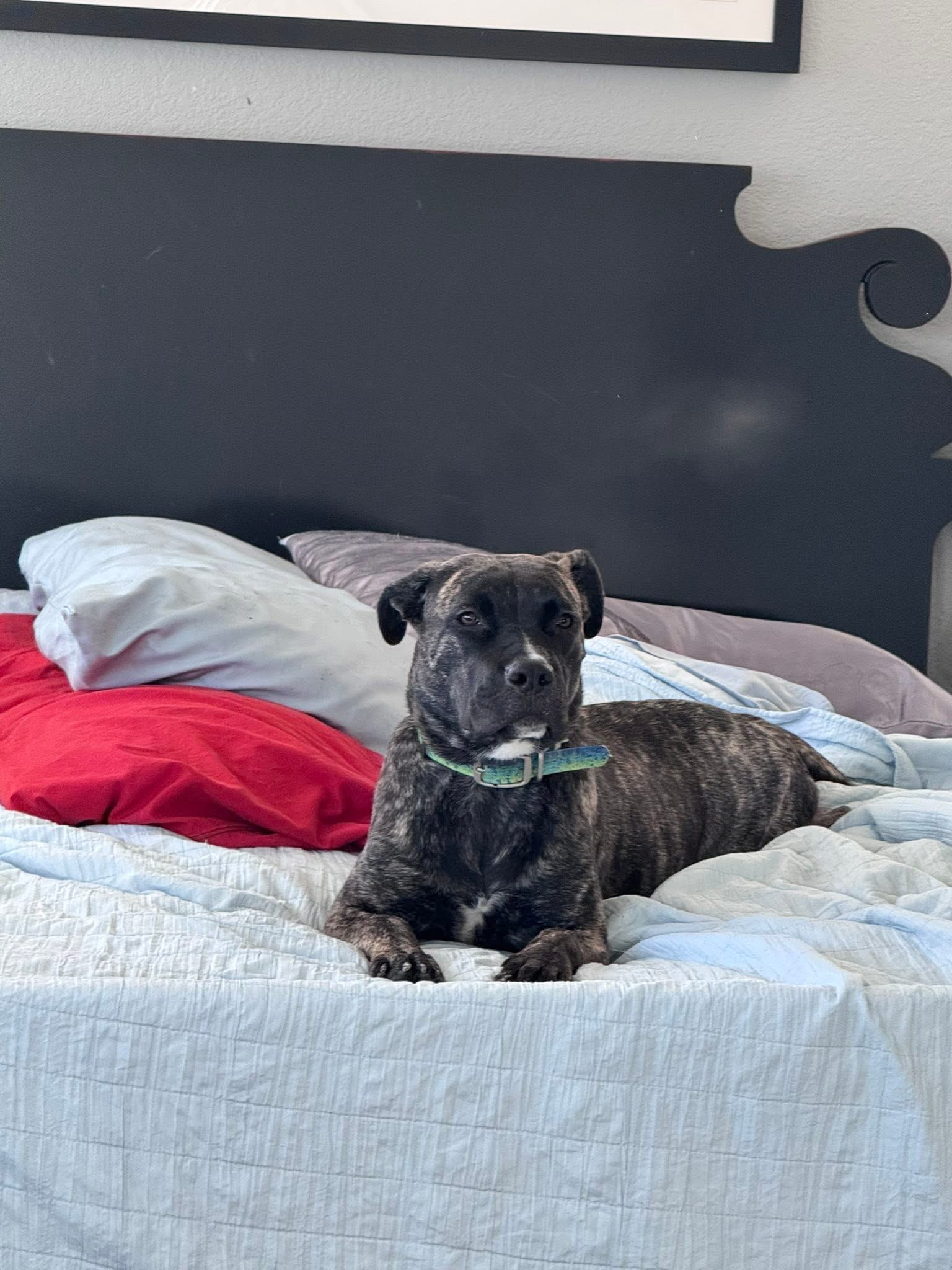 I’m basically the full package: beauty, brains, bounce, and just a touch of dramatic flair. At 62 pounds, I’m what you might call “athletic goddess meets goofball roommate.” I’m about a year old and my foster mom thinks I’m a pittie/boxer/mastiff mix!